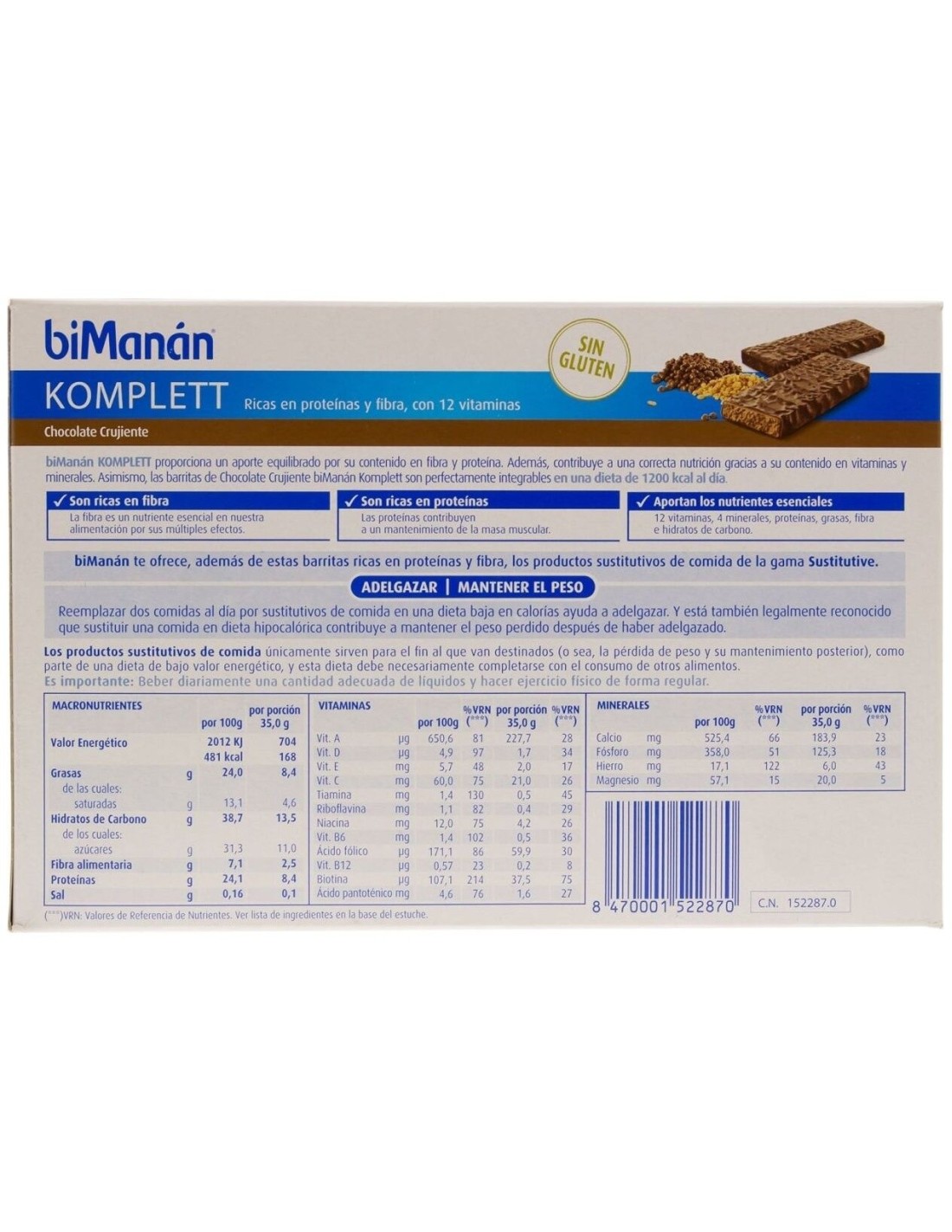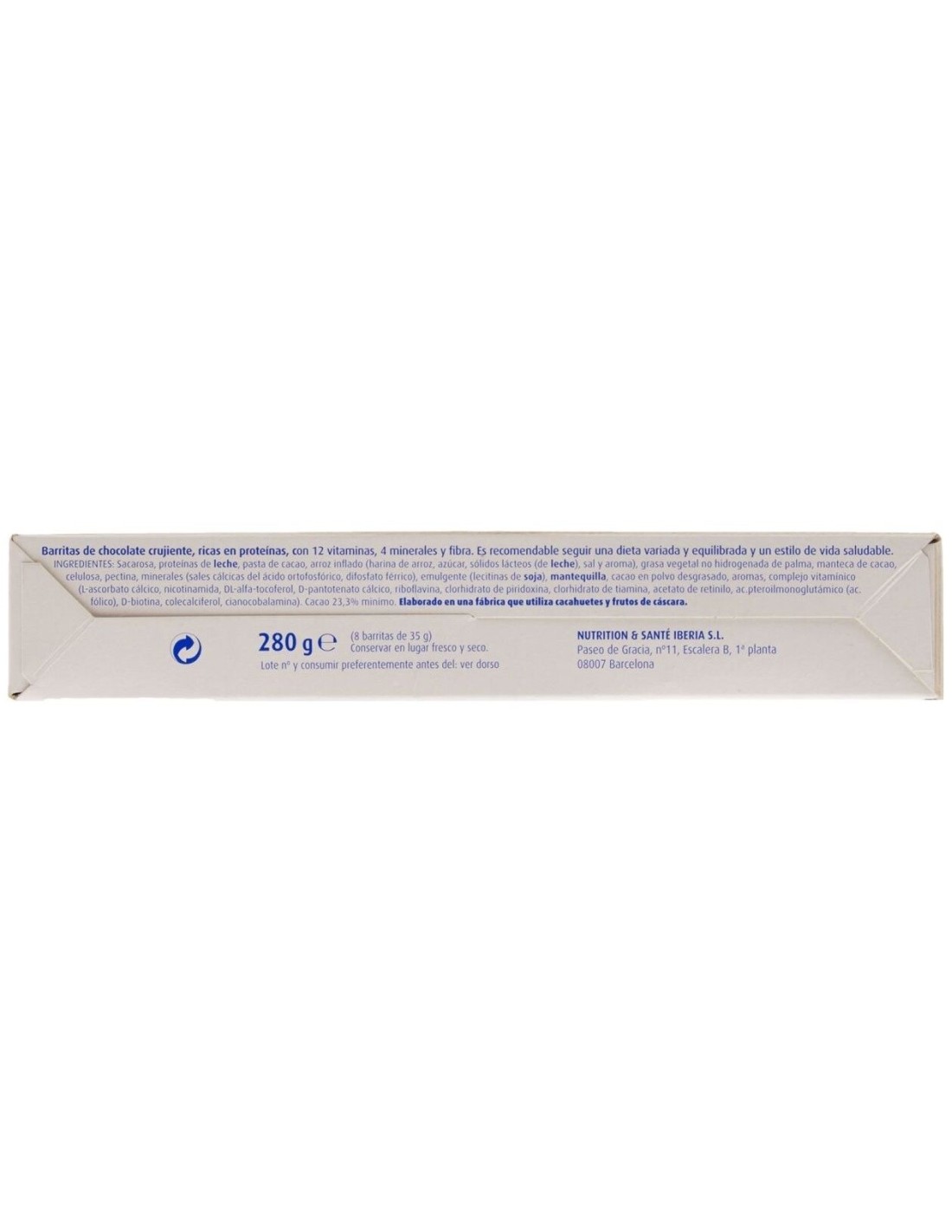 Por unidad (35 g.): Calcio: 178 mg Fósforo: 89,7 mg Potasio: 276 mg Hierro: 3,2 mg Zinc: 4,5 mg Vitamina A: 244 mcg Vitamina D: 1,6 mcg Vitamina E: 1,9 mg Vitamina C: 21 mg Tiamina: 0,53 mg Riboflavina: 0,34 mg Niacina: 4,2 mg Vitamina B6: 0,46 mg Ácido Fólico: 57,8 mcg Vitamina B12: 0,19 mcg Biotina: 36 mcg Ácido Pantoténico: 1,6 mg Cobre: 0,19 mg Yodo: 23,8 mcg Selenio: 10 mcg Magnesio: 30,9 mg Manganeso: 0,19 mg Sabor chocolate crujiente: Azúcar, proteínas de la leche, pasta de cacao, arroz inflado (8%) (harina de arroz, azúcar, lactosuero en polvo, sal), aceiete de girasol alto oleico, estabilizante (celulosa), manteca de cacao, fibra alimentaria (inulina), gelificante (pectina), minerales (sales cálcicas del ácido ortofosfórico, difosfato férrico), emulgente (lecitina de soja), cacao desgrasado en polvo (1%), mantequilla (leche), aromas naturales, vitaminas (L-ascorbato cálcico, nicotinamida, DL.alfa tocoferol, D-pantotenato cálcico, riboflavina, clorhidrato de piridoxina, clorhidrato de tiamina, acetato de retinilo, ácido pteroilmonoglutámico (ácido Fólico), D-biotina, colecalciferol, cianocobalamina.
