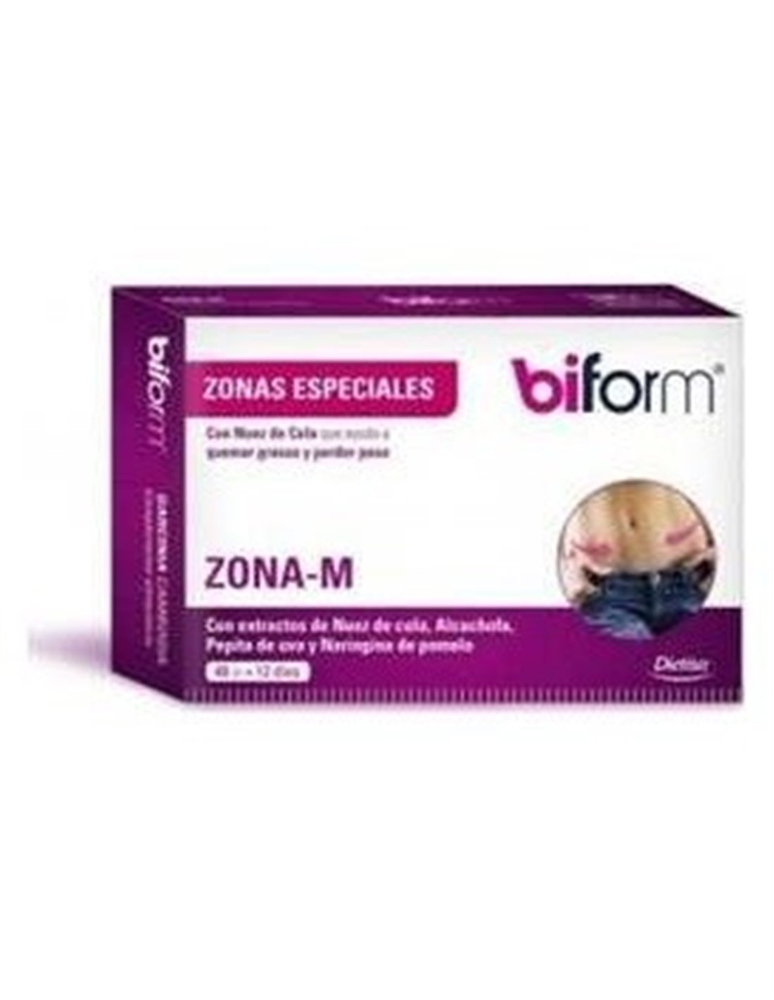 Complemento alimenticio a base de fibra de avena, nuez de cola, alcachofa, Citrus paridisi (naringina de pomelo) y pepita de uva, que ayuda a quemar grasa y perder peso. BIFORM ZONA M 48cap.