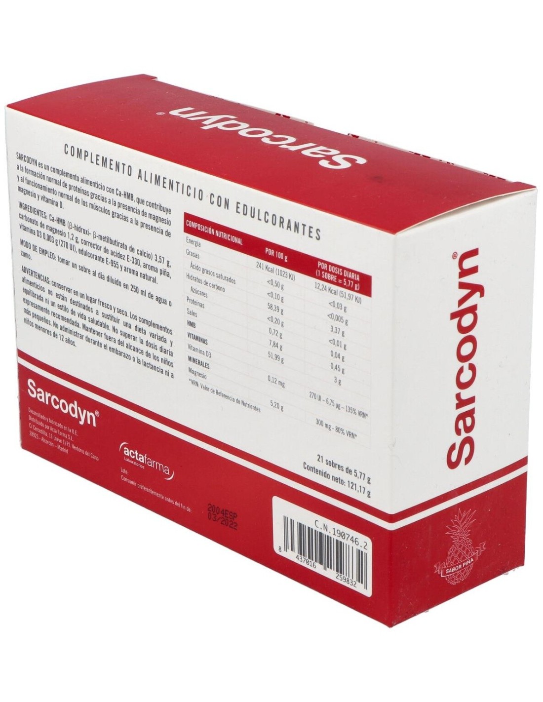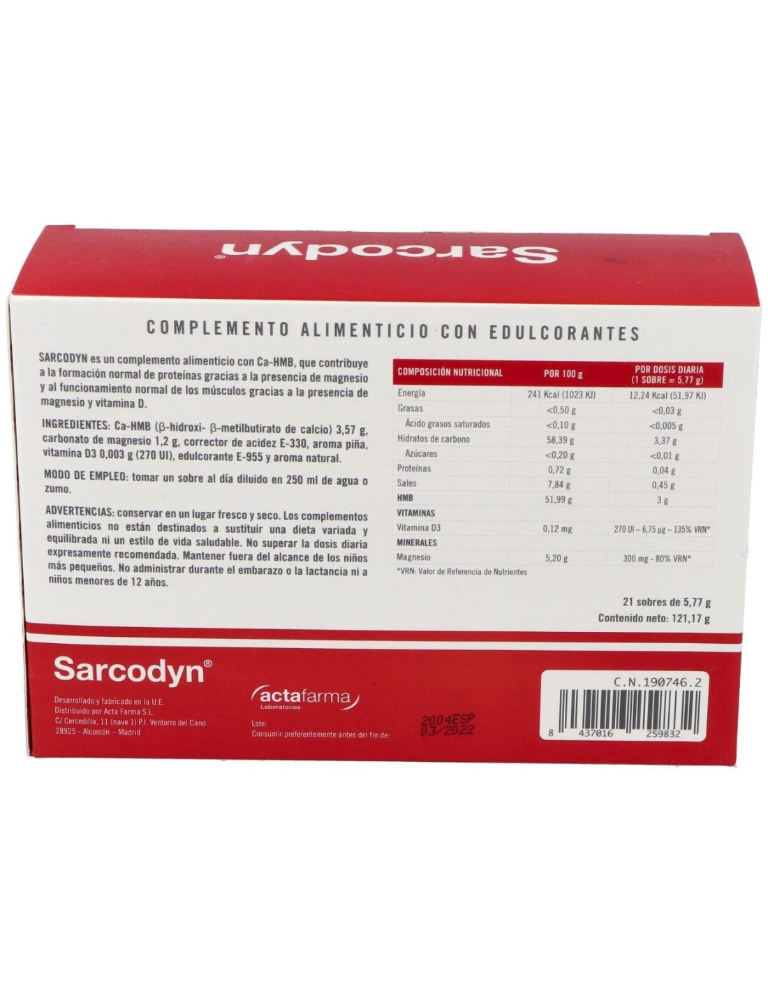 Ingredientes:Ca-HMB (B-hidroxi- B-metilbutirato de calcio) 3,57 g. carbonato de magnesio 1,2 g, corrector de acidez E-330, aroma piña, vitamina D3 0,003 g (270 UI), edulcorante E-955 v aroma naturalModo de empleo:Tomar 1 sobre al día diluido en 250 ml de agua o zumo.Presentación:Envase de 21 sobres.Recomendaciones y advertencias:No utilizar durante el embarazo o la lactancia, en niños y adolescentes.