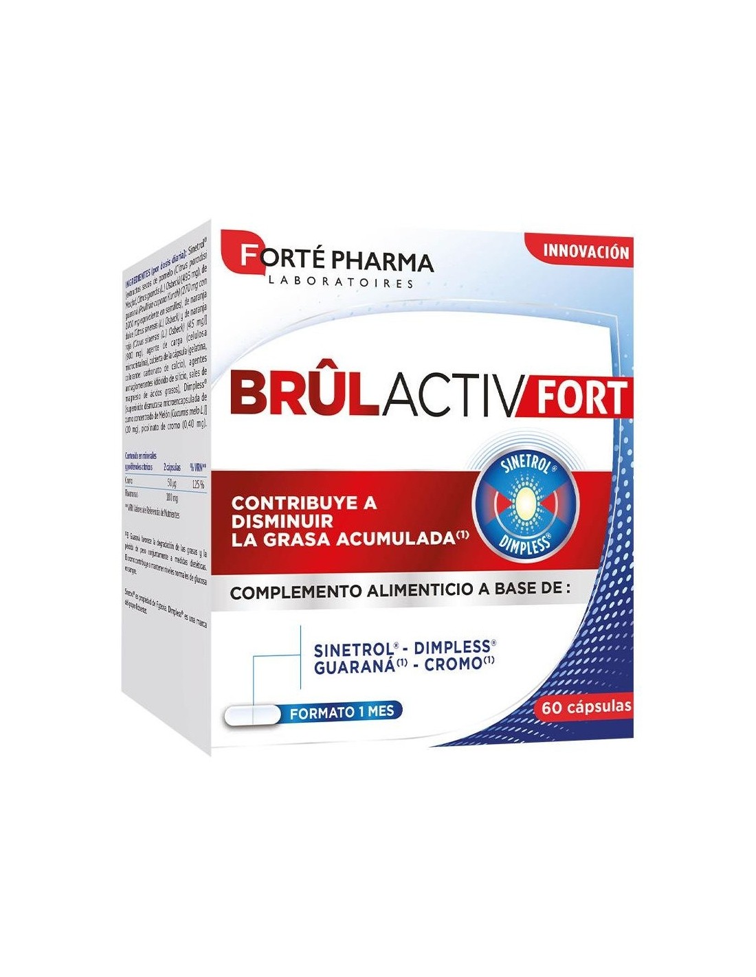 Brulactiv Fort, de FORTE PHARMA, es un complemento alimenticio compuesto por 2 ingredientes principales: El complejo Sinetrol®, que contiene polifenoles de cítricos y guaraná, que favorecen la descomposición de las grasas y la pérdida de peso como complemento de las medidas dietéticas. Este complejo ha sido objeto de un estudio científico que ha demostrado la eficacia de su mecanismo de acción. El ingrediente de Dimpless®, que contiene superóxido dismutasa, que es extraído de una variedad específica del melón. Esta característica de microencapsulación realiza una acción adelgazante que ayuda a mantener los niveles normales de azúcar en sangre.