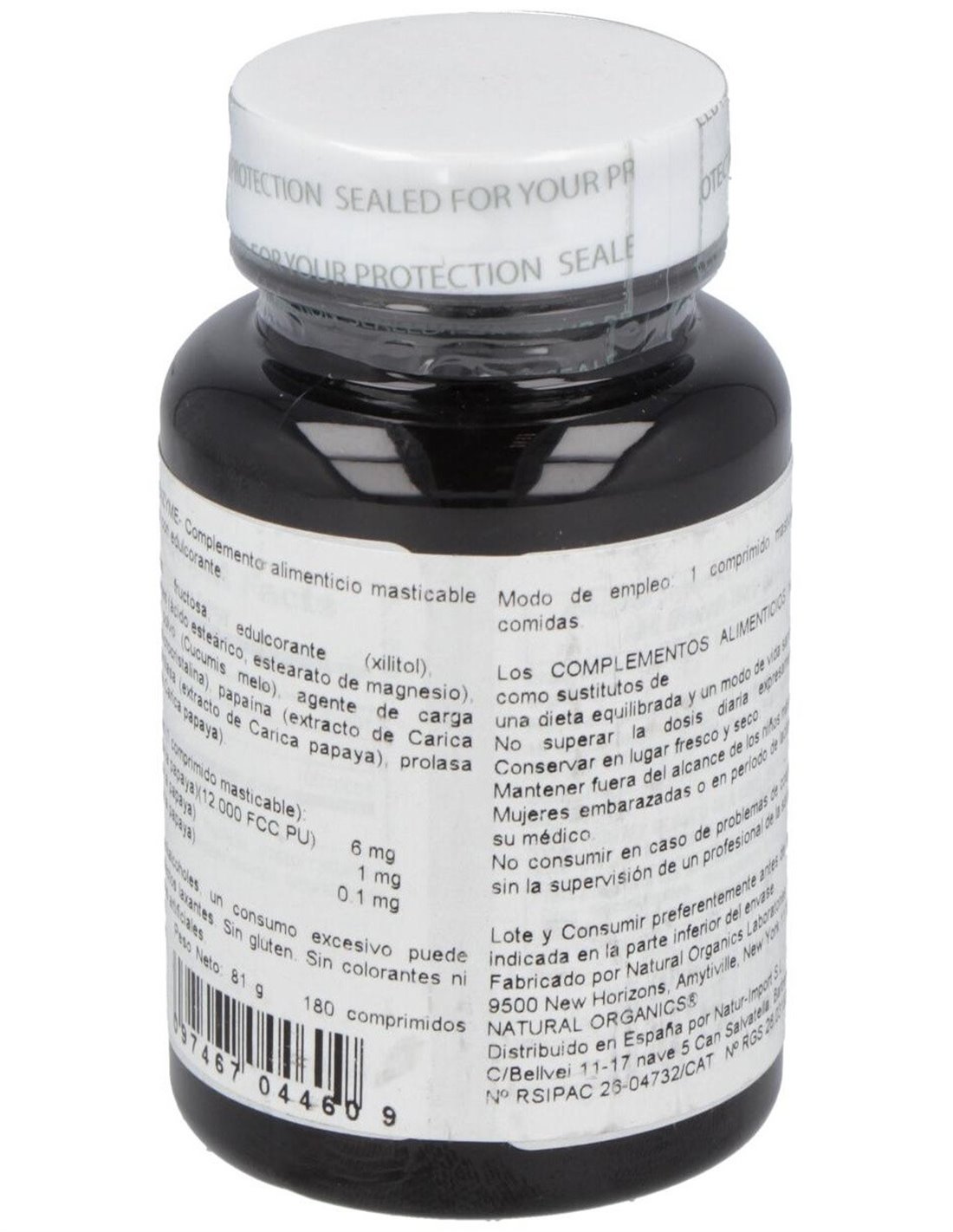 Comprimidos masticables formulados con el fruto maduro y las hojas de la papaya. La Papaína es una enzima similar a la pepsina humana que descompone las proteínas y favorece el proceso digestivo. Apto para vegetarianos.