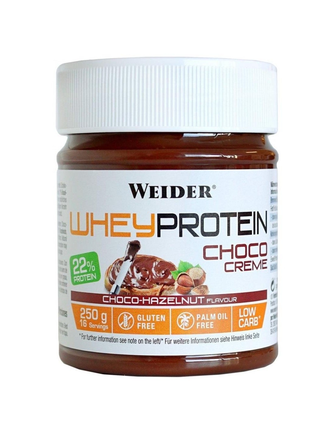 WEIDERWhey Protein Choco Creme es una deliciosa crema de cacao para untar elaborada con auténticas avellanas y proteína de suero de alta calidad. Sin aceite de palma ni gluten. Baja en carbohidratos.