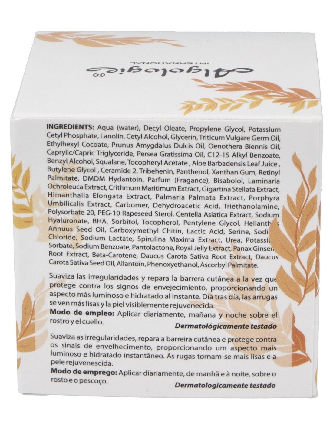 Aloe Vera, Ácido Hialurónico, Zanahoria, Germen de Trigo, Centella asiática, Onagra, Chitina, Almendras dulces, Algas Marina, Aceites de Aguacate, Bisabolol natural, Dermaxyl, Escualeno vegetal, Ginseng Panax.