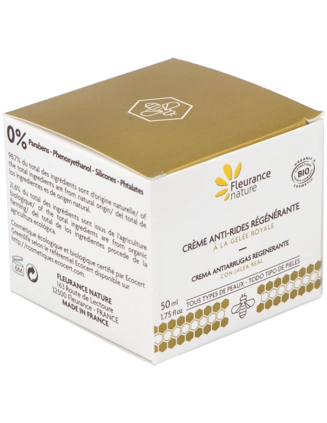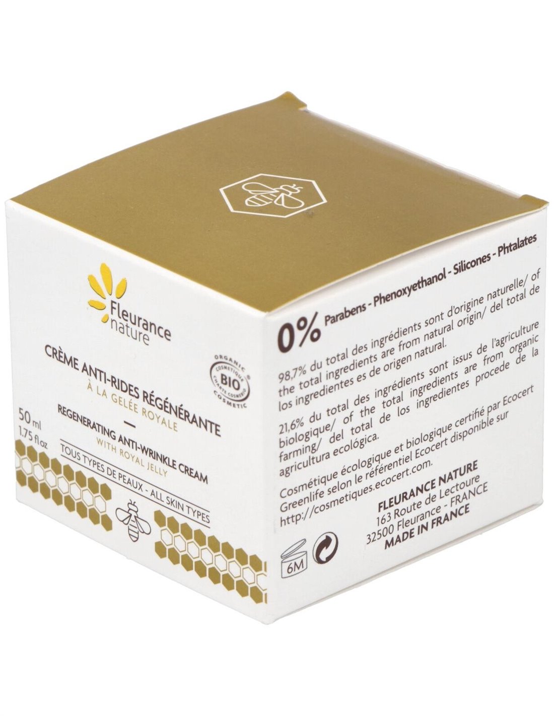 Crema Antiarrugas Regenerante con Jalea Real de Fleurance Nature es recomendada para retrasar la aparición de los signos de la edad y estimular la regeneración de su piel, este tratamiento hidratante, antiarrugas* y regenerador, asocia a la jalea real activos con propiedades antioxidantes, redensificantes y nutritivas con las virtudes revitalizantes de la jalea real.¡Las arrugas y las líneas finas se desvanecen, la tez se unifica, y la piel recupera brillo y elasticidad!Principios activos:
