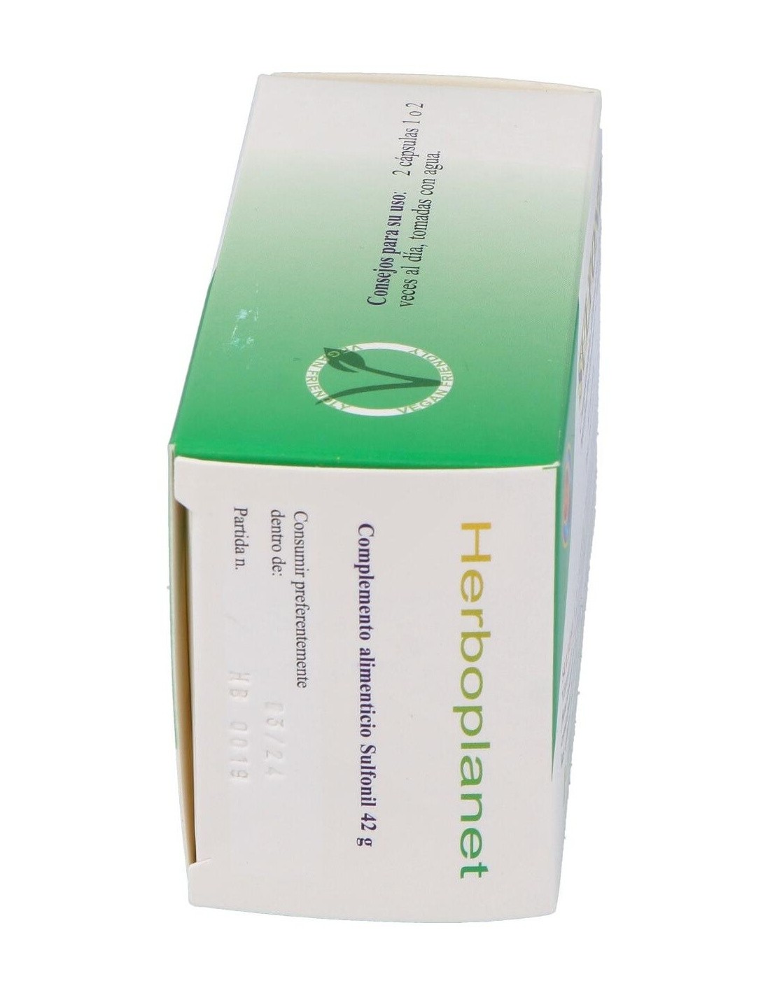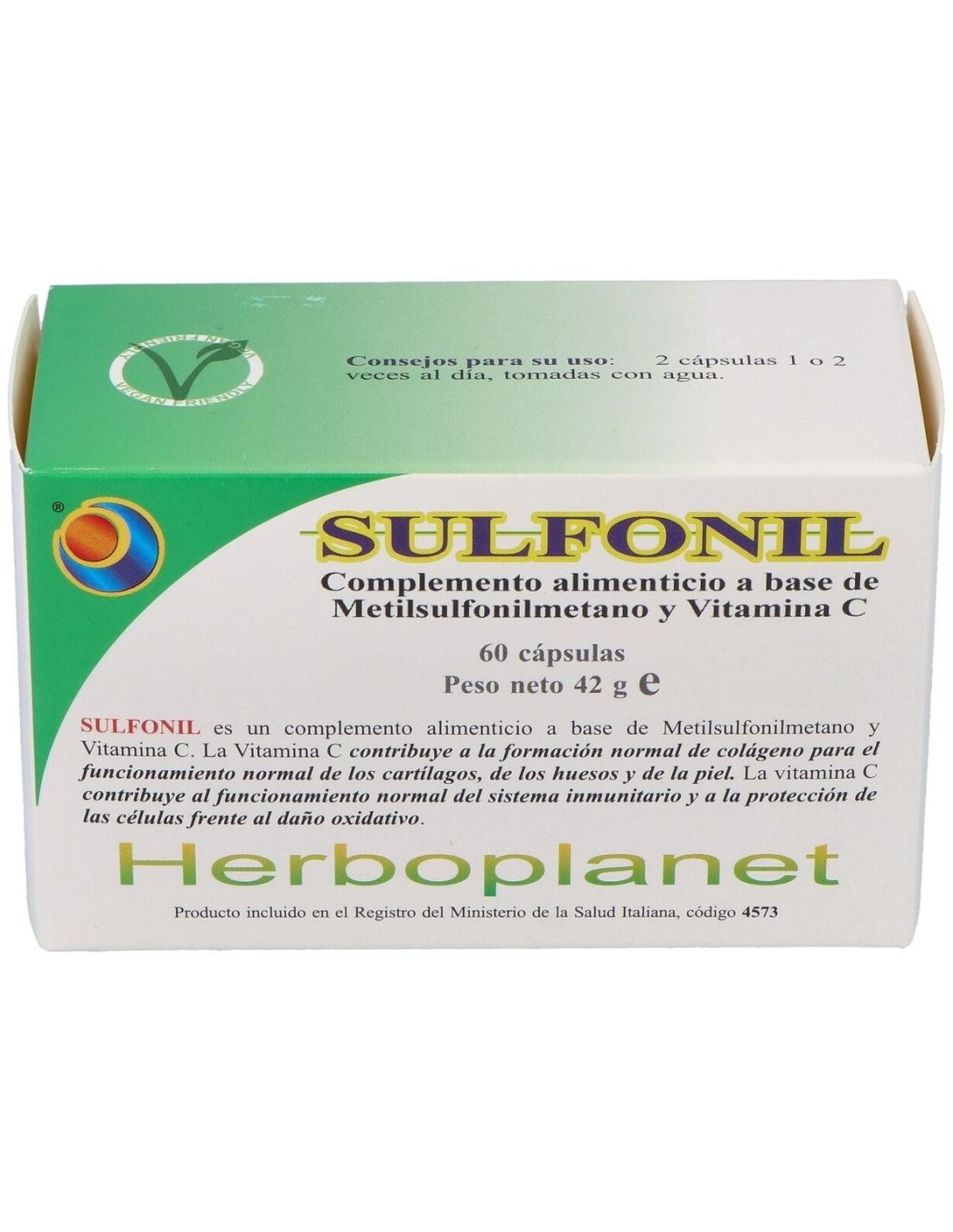 Sulfonil de Herboplanet es un producto recomendado en casos de alergias, artritis y artrosis, artritis reumatoide, constipación, diabetes, enfisema pulmonar, intolerancia alimentaria, restablecimiento de la elasticidad cutánea. Verminosis. Intoxicaciones. Lupus.El Metil Sulfonil Metano es una forma natural del azufre orgánico, de la que su fórmula química es CH3SO2CH3. Se trata de la forma en que el azufre está presente en la naturaleza, en el interior de todos los organismos vivientes, donde actúa como sustancia biológicamente activa. El Metil Sulfonil Metano es un polvo sin olor, blanco y cristalino, altamente soluble en agua caliente y en una amplia variedad de solventes orgánicos.Experimentos sobre el Metil Sulfonil Metano, con trazadores radioactivos, han demostrado que, después de haber sido ingerido, el Metil Sulfonil Metano se liga a las mucosas. Parece de hecho que el Metil Sulfonil Metano se dirija hacia sitios receptores sobre la superficie de la membrana mucosa en el tracto intestinal, en el urogenital y en el sistema respiratorio, constituyendo de esta manera un interfaz de protección entre el huésped y el ambiente externo.Ingredientes por 4 cápsulas:Metil Sulfonil Metano (azufre orgànico) 2 g, Ascorbato de calcio 198 mg (aporte en Vitamina C 162,4 mg = 203% CDR). Agentes de carga: celulosa microcristalina,sales de magnesio de los ácidos grasos. Cápsula de gelatina alimentaria.Modo de empleo:Tomar 2 cápsulas 2 veces al día.Presentación:Envase de 60 cápsulas.