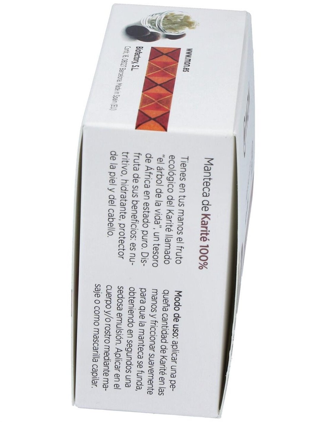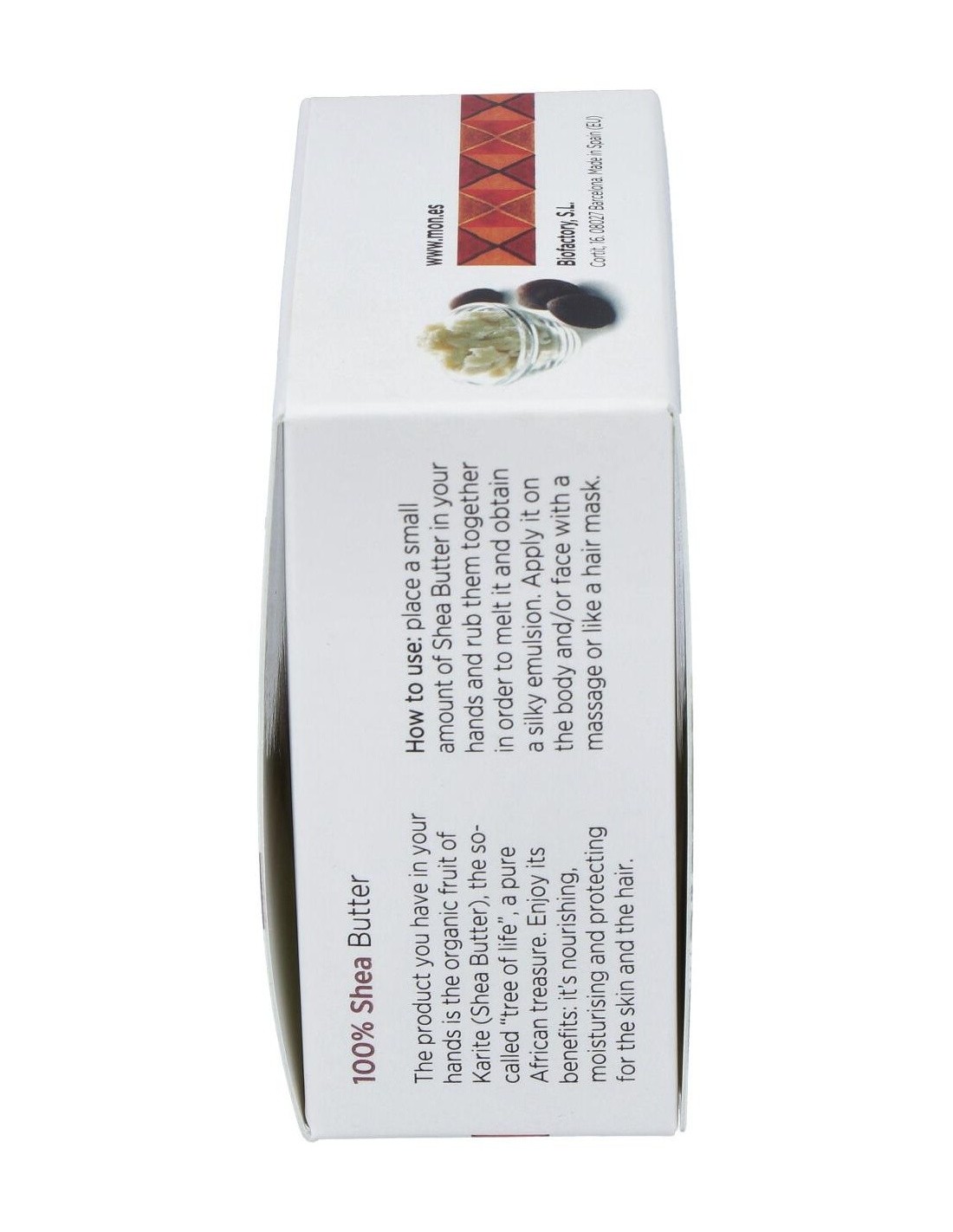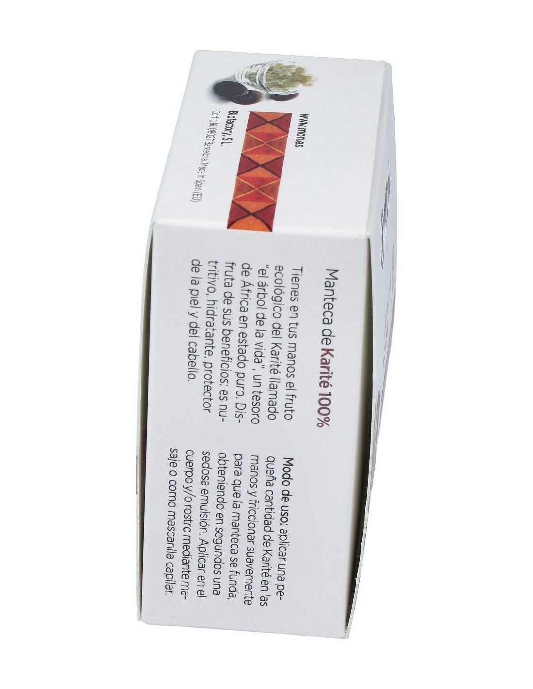 Composición:100% manteca de karité ecológica. Modo de empleo:Aplicar en la palma de la mano para untarla después en la parte del cuerpo que se desee. Presentación:Envase de 100 ml.