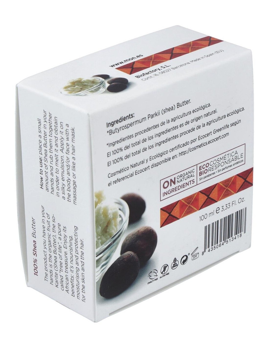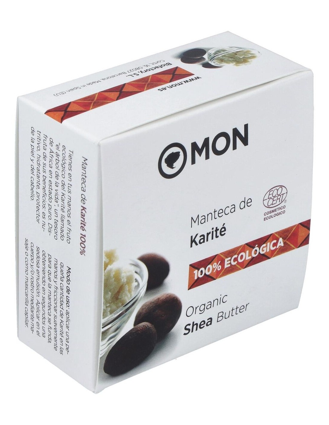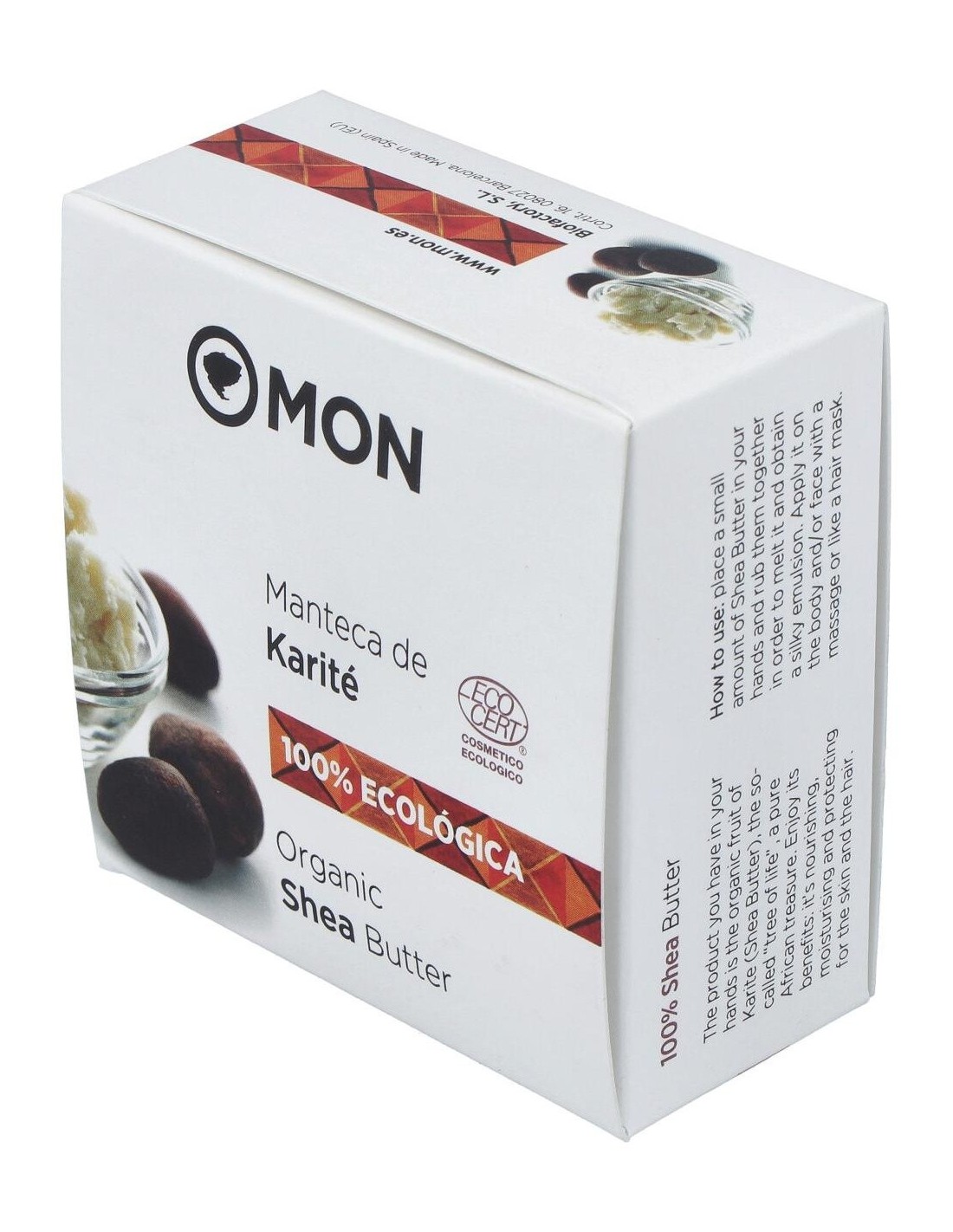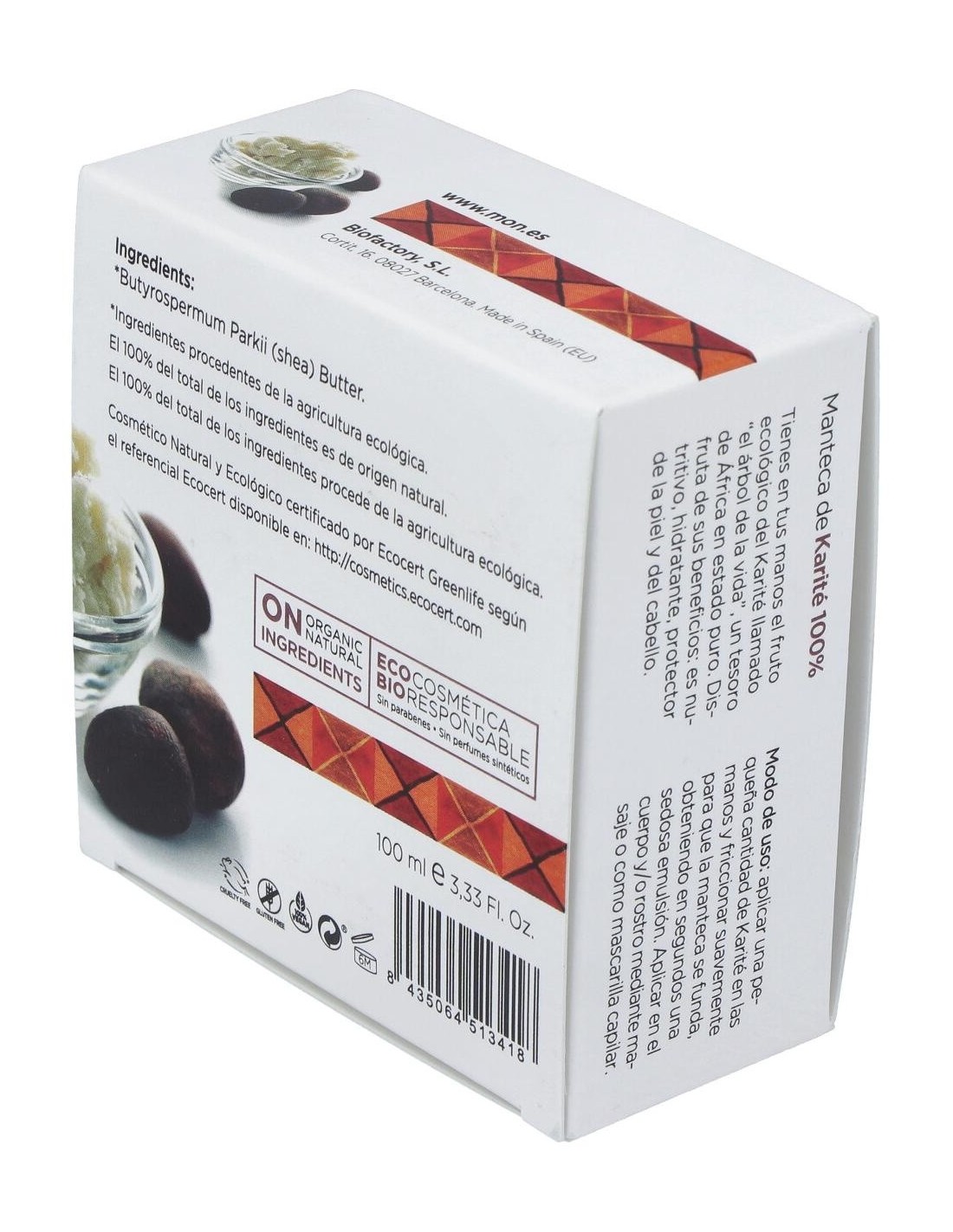 Composición:100% manteca de karité ecológica. Modo de empleo:Aplicar en la palma de la mano para untarla después en la parte del cuerpo que se desee. Presentación:Envase de 100 ml.