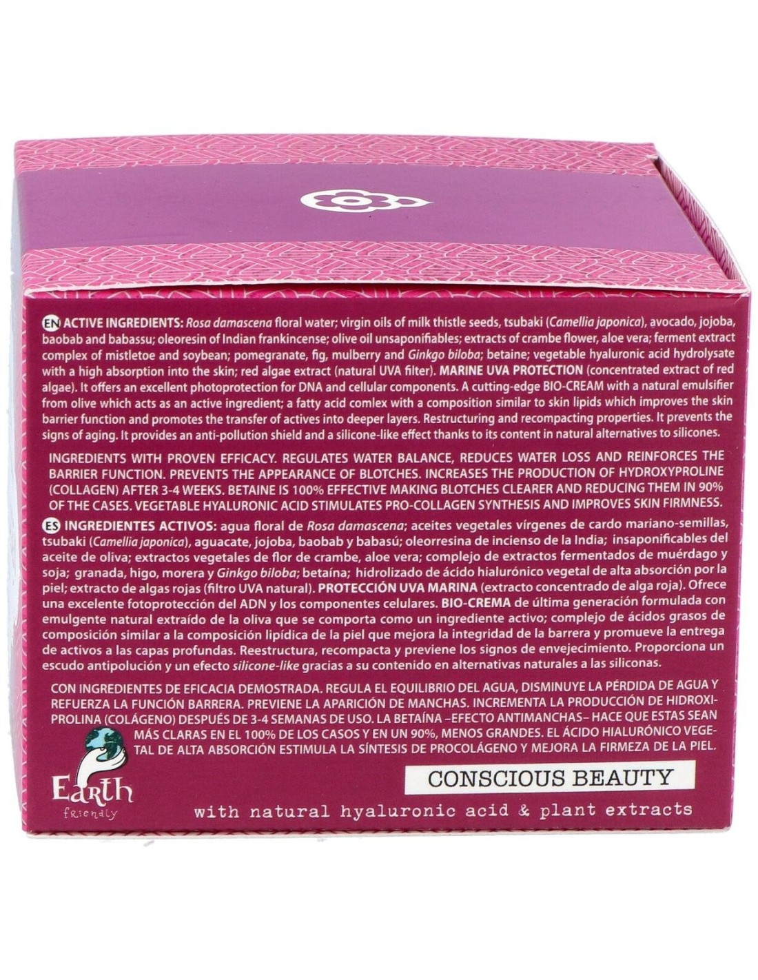 Crema día con ácido hialurónico natural y extractos de plantas, que proporciona hasta 12 horas de hidratación. Refuerza la función barrera, incrementa la producción de colágeno. La crema previene la aparición de manchas. Mejora la firmeza de la piel gracias al ácido hialurónico vegetal de alta absorción que estimula la síntesis de procolágeno y mejora la firmeza de la piel. Incrementa la producción de hidroxiprolina (colágeno) después de 3-4 semanas de uso. Además, es una línea natural de cuidado facial antiedad porque potencia la producción de colágeno en la piel, hidrata, nutre y regenera la piel. Proporciona antioxidantes naturales para combatir el paso del tiempo. Está indicada para todo tipo de pieles. Testado bajo control dermatológico.