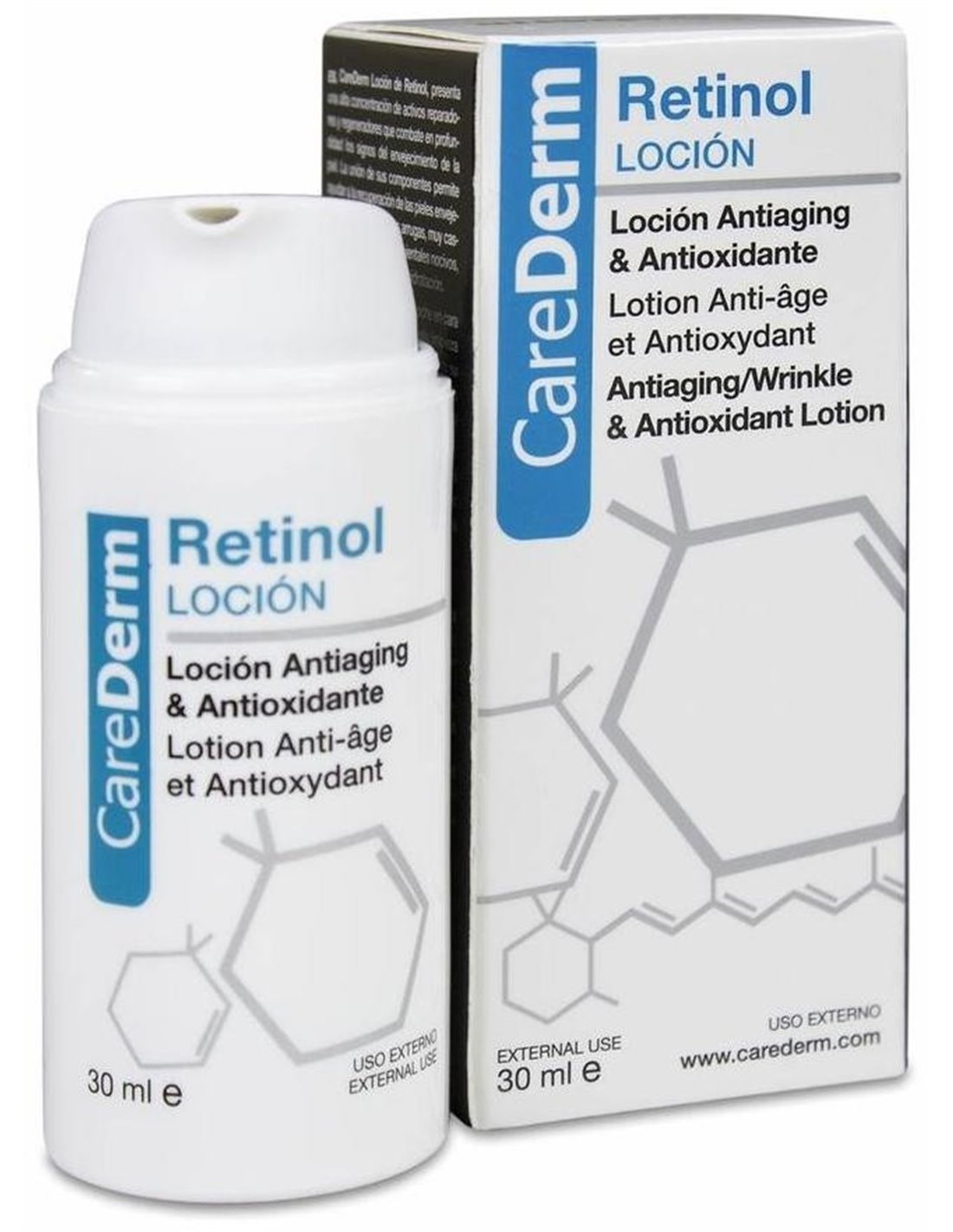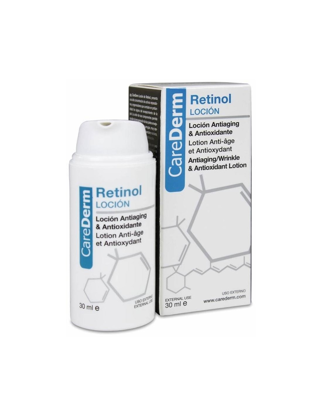Carederm loción de Retinol 30ml tiene una exclusiva fórmula que permite ayudar a la recuperación de las pieles envejecidas, con tendencia a las arrugas, muy castigadas por los agentes ambientales nocivos, con flacidez facial.