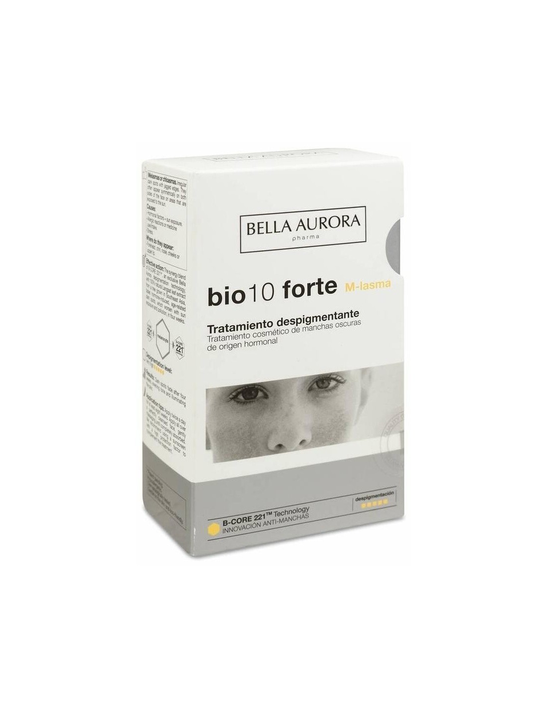Tratamiento antimanchas intensivo que reduce y elimina las manchas existentes y previene la aparición de nuevas de origen hormonal, con una combinación de activos que incorpora la exclusiva tecnología despigmentante B-CORE 221TM. Un sistema de encapsulación y liberación dirigida. Actúa directamente sobre las células productoras de melanina dónde libera íntegramente el activo encapsulado, obteniendo así una mayor eficacia.