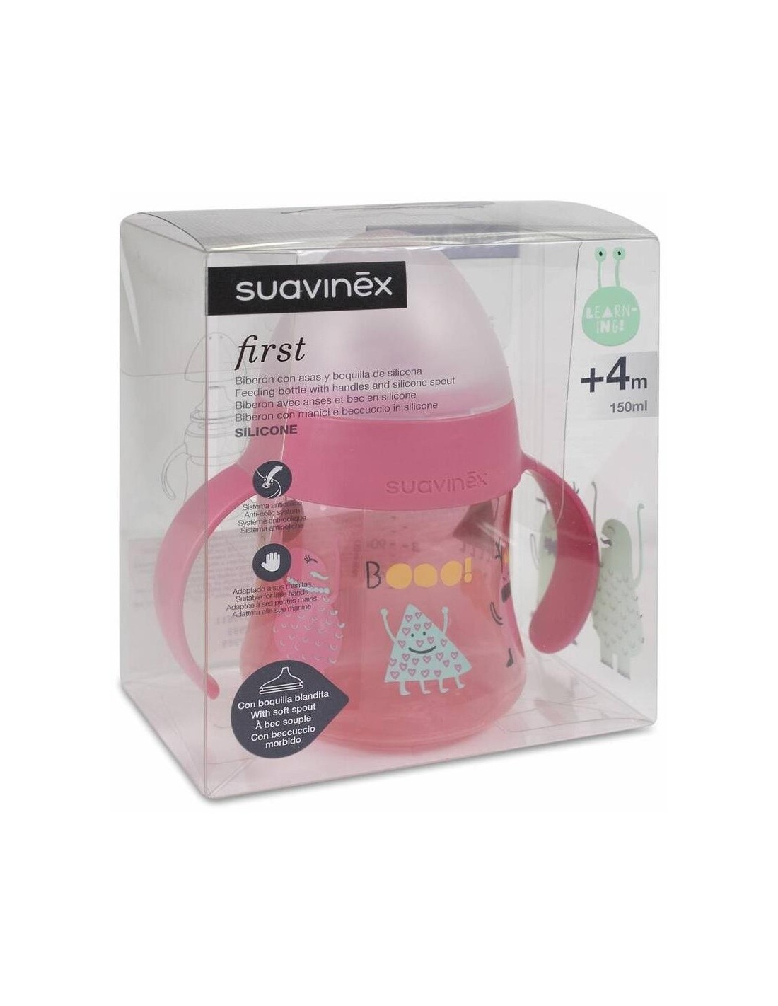 SUAVINEXBiberones Prints First con boquilla de silicona para bebés a partir de 4 meses y capacidad para 150 ml. Incorpora asas adaptadas a manitas pequeñas, la rosca con asitas es adaptable a cualquier biberón de Suavinex, exceptuando el biberón Zero.ZeroTM. Tetina ideal para facilitar la etapa de tránsito del biberón al vaso. Gracias a su boquilla antiderrame facilita el tránsito del bebé del biberón al vaso ya que el líquido solo sale cuando el bebé succiona. Tetinas de biberón avaladas por la Sociedad Española de Odontopediatría, SEOP.\ \ *El color y/o diseño del producto puede variar.