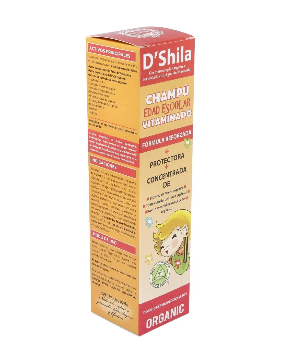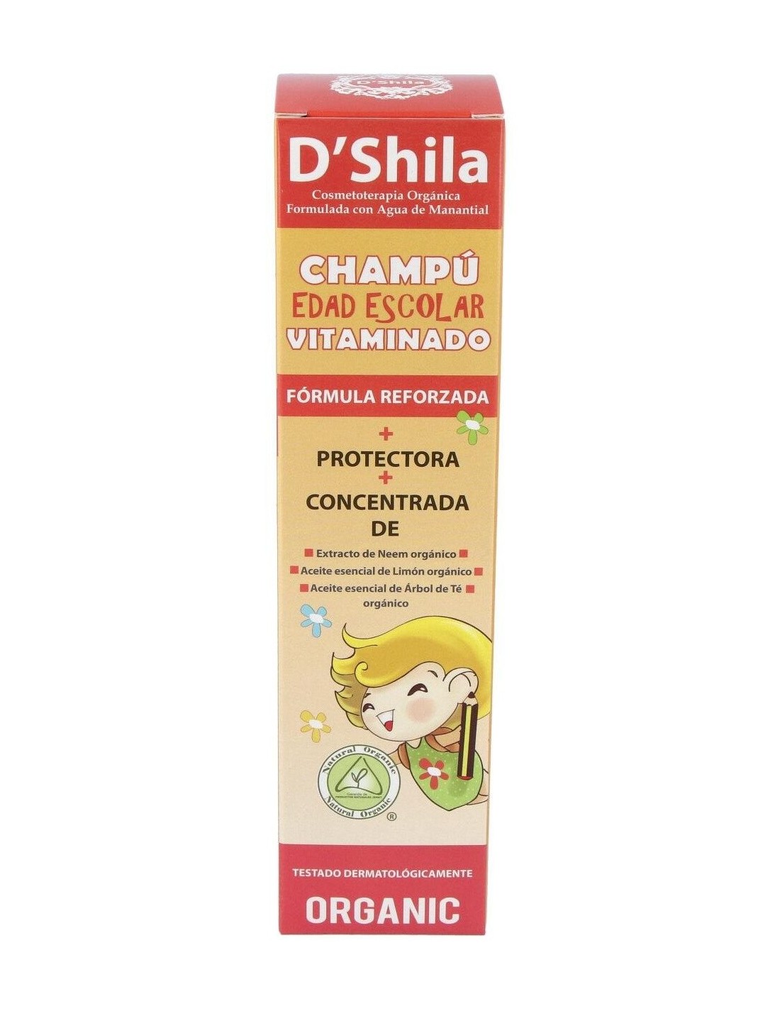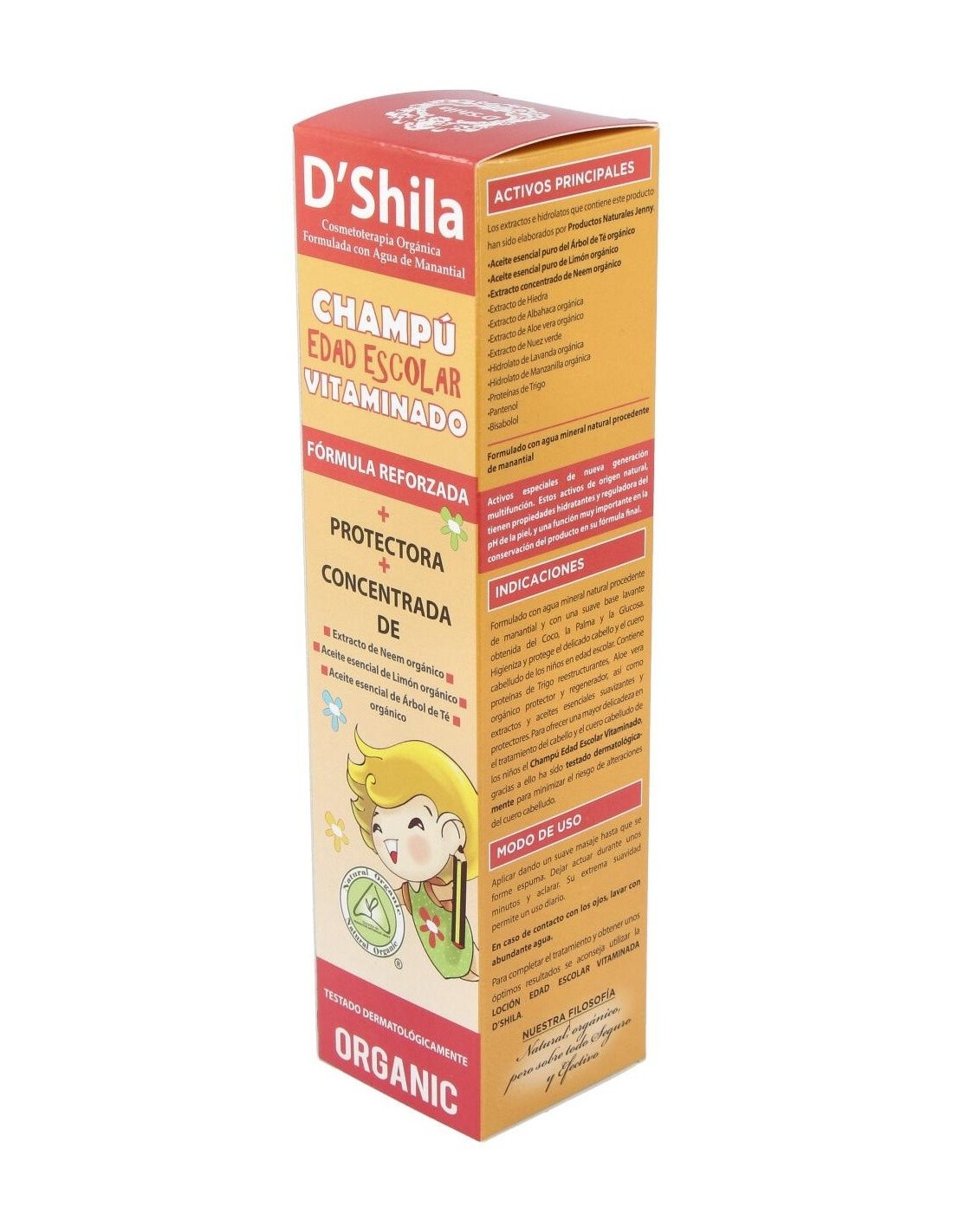 Formulado con agua mineral natural procedente de manantial y con una suave base lavante obtenida del Coco, la Palma y la Glucosa. Higieniza y protege el delicado cabello y el cuero cabelludo de los niños en edad escolar. Contiene proteínas de Trigo reestructurantes, Aloe vera orgánico protector y regenerador, así como extractos y aceites esenciales suavizantes y protectores. Para ofrecer una mayor delicadeza en el tratamiento del cabello y el cuero cabelludo de los niños el Champú Edad Escolar Vitaminado, gracias a ello ha sido testado dermatológicamente para minimizar el riesgo de alteraciones del cuero cabelludo.Principales activos: