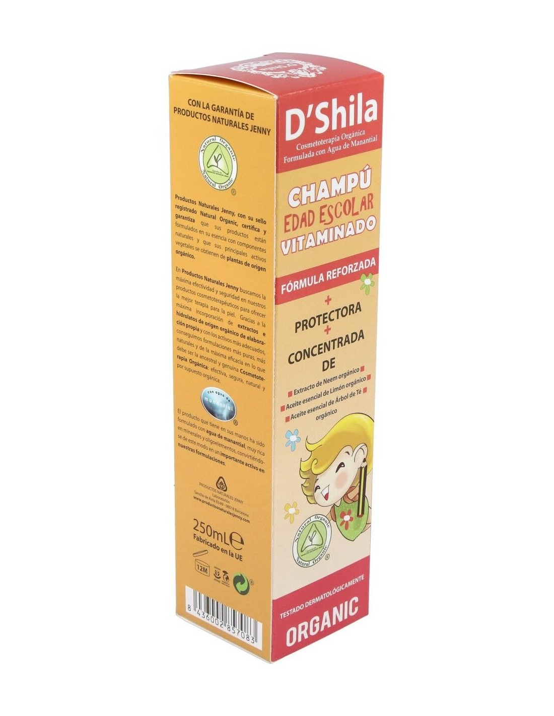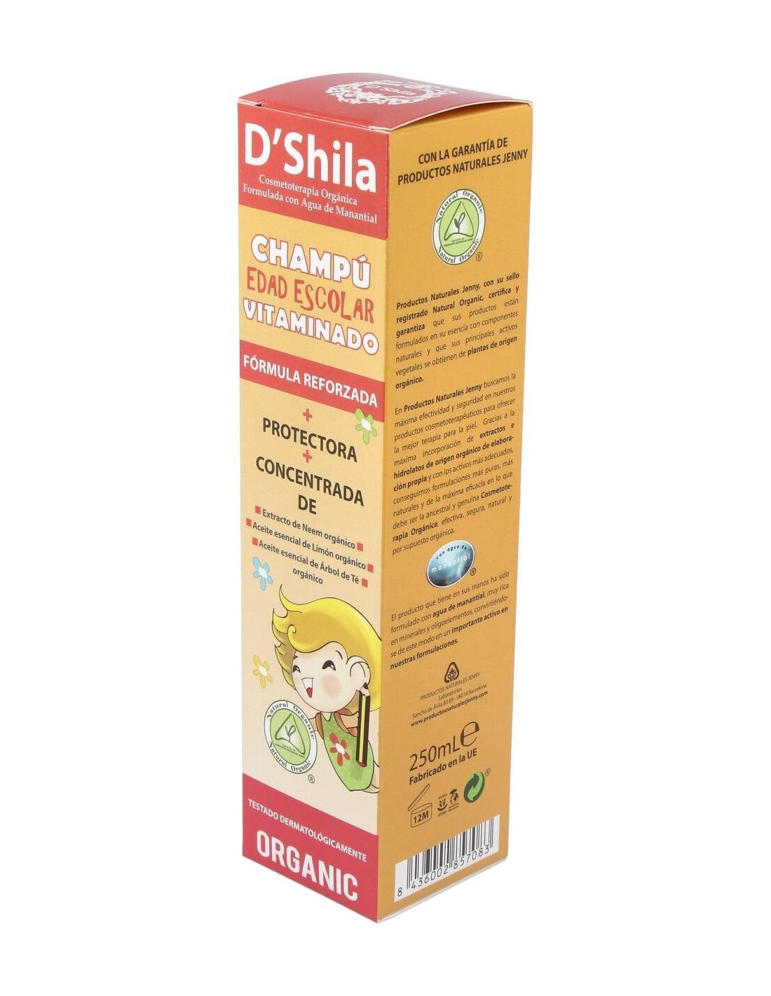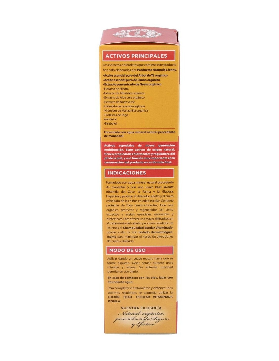 Formulado con agua mineral natural procedente de manantial y con una suave base lavante obtenida del Coco, la Palma y la Glucosa. Higieniza y protege el delicado cabello y el cuero cabelludo de los niños en edad escolar. Contiene proteínas de Trigo reestructurantes, Aloe vera orgánico protector y regenerador, así como extractos y aceites esenciales suavizantes y protectores. Para ofrecer una mayor delicadeza en el tratamiento del cabello y el cuero cabelludo de los niños el Champú Edad Escolar Vitaminado, gracias a ello ha sido testado dermatológicamente para minimizar el riesgo de alteraciones del cuero cabelludo.Principales activos: