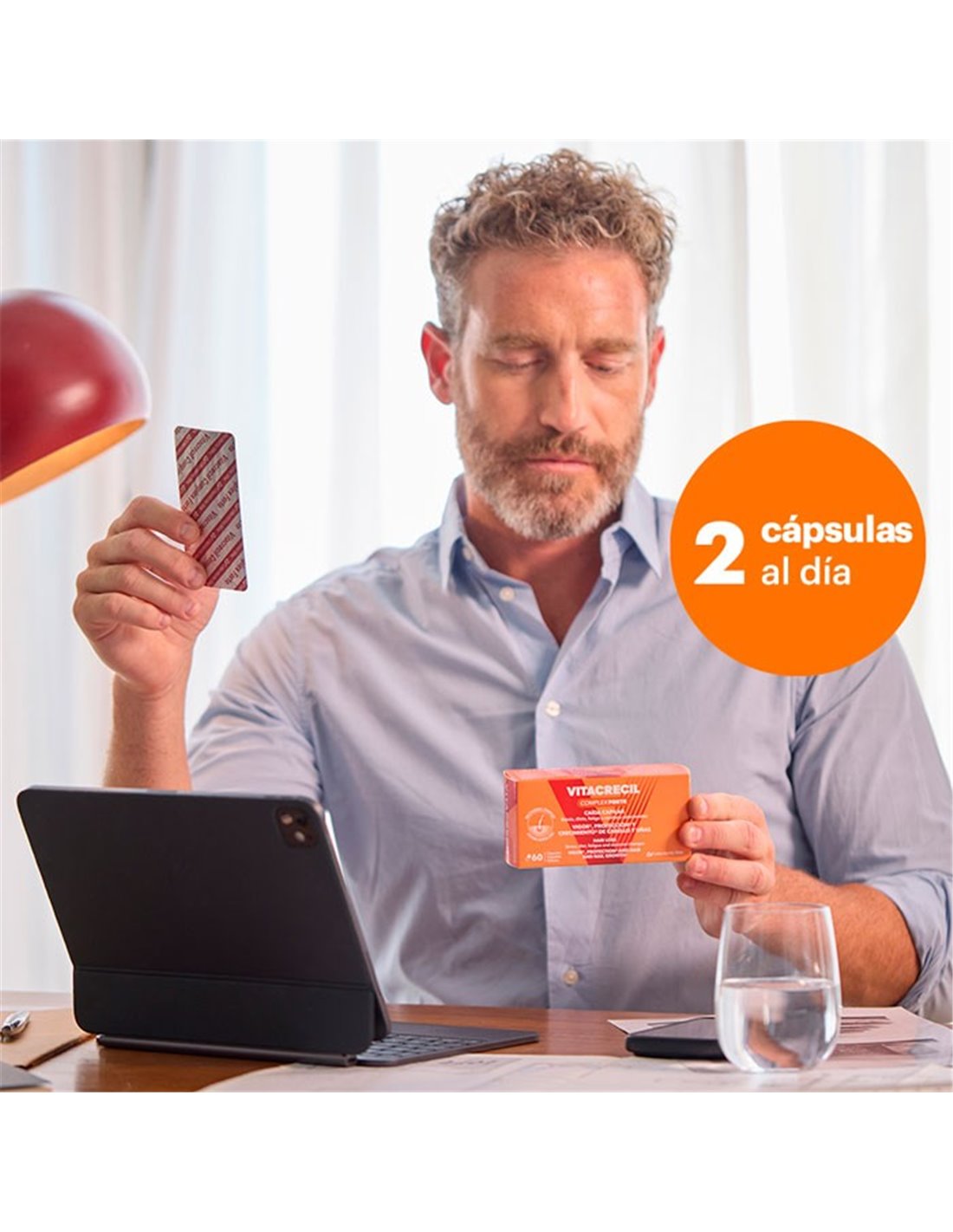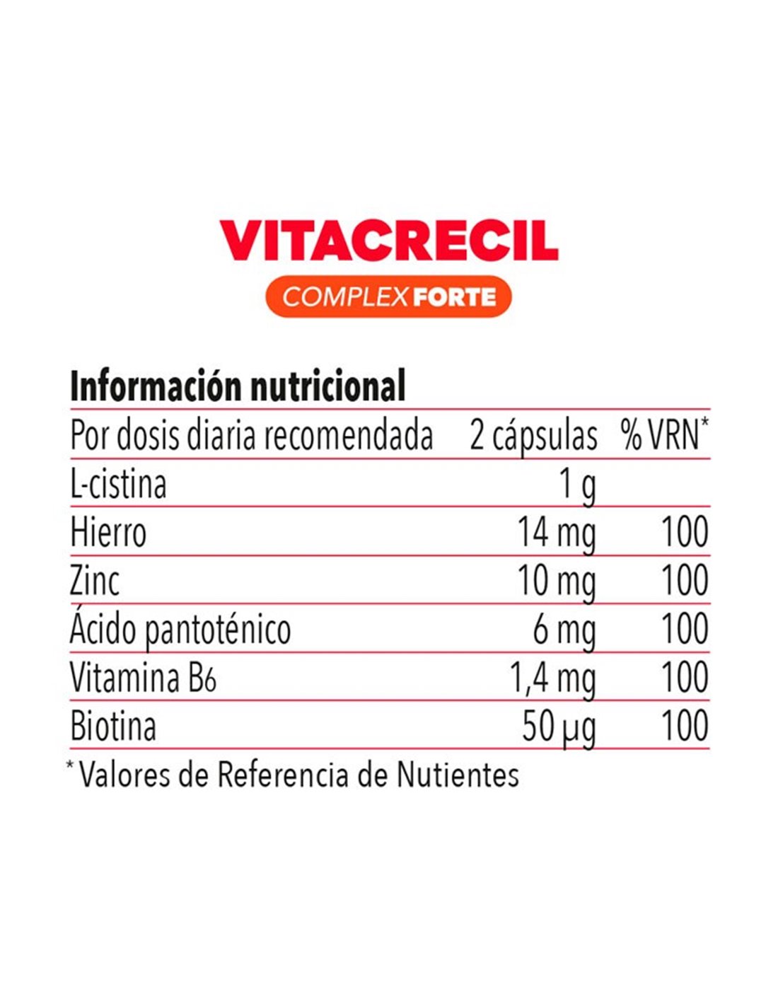 Vitacrecil Complex Forte es un complemento alimenticio con una combinación equilibrada de elementos nutritivos para la nutrición de cabellos y uñas. Vitacrecil Complex Forte es una fórmula reforzada que contiene L-cistina, ácido pantoténico, vitamina B6, biotina, hierro y zinc, con un mayor contenido en L-cistina y hierro. Una ingesta adecuada de zinc es uno de los factores que ayudan a mantener el cabello y las uñas en condiciones normales. La biotina es una vitamina cuyo aporte dietético suficiente contribuye al normal mantenimiento del cabello. La cistina es un aminoácido azufrado constitutivo de la queratina. Apto para intolerantes a la lactosa.