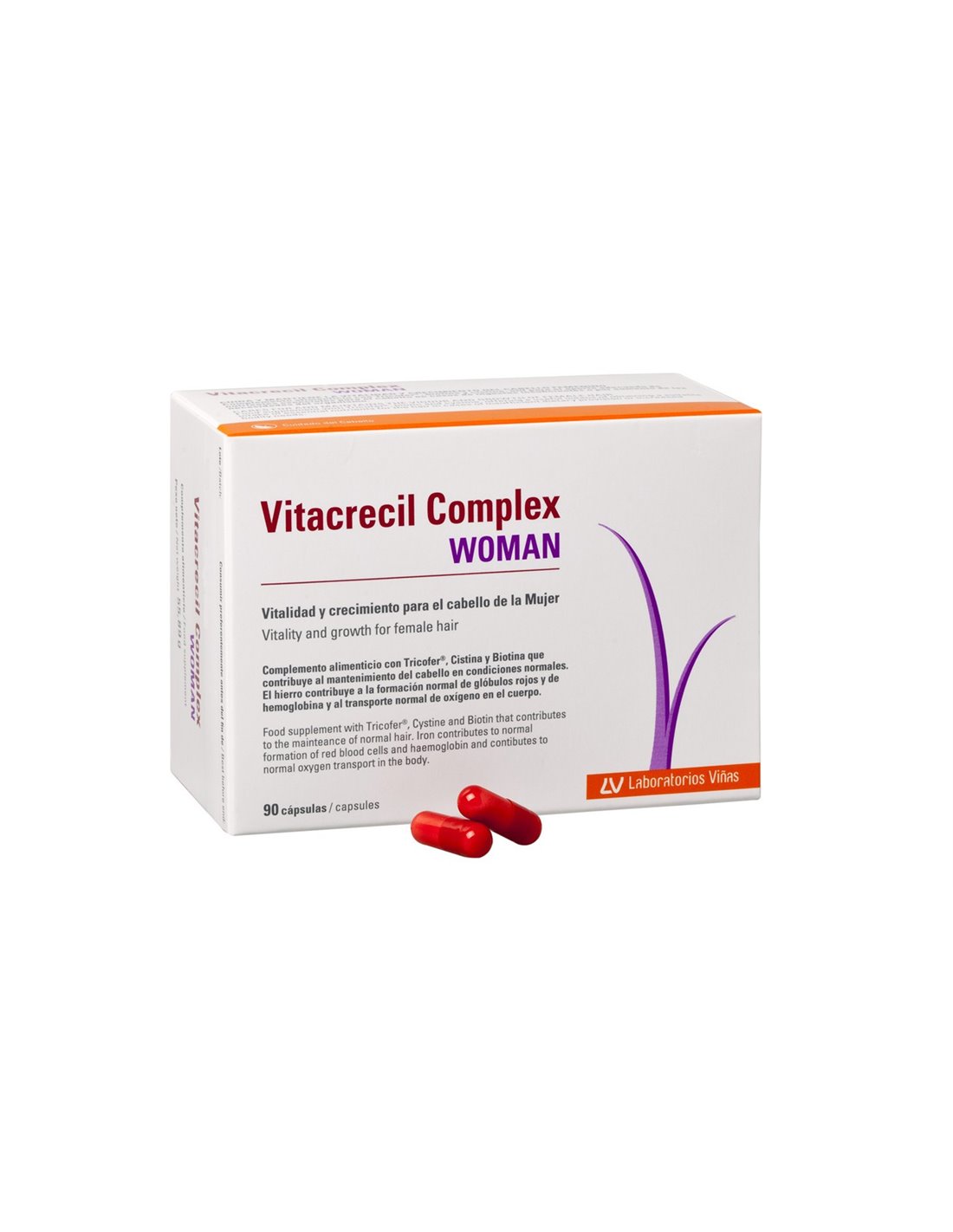 Vitacrecil Complex Woman es un complemento alimenticio con hierro (Tricofer®), cistina y biotina, combinación de nutrientes esenciales específicamente diseñada para la vitalidad, el crecimiento y el metabolismo del cabello, especialmente útil para situaciones de déficits nutricionales que afecten el cabello de la mujer. El hierro (Tricofer®) contenido en Vitacrecil Complex Woman representa una fuente de hierro con una elevada biodisponibilidad que permite mejorar su tolerabilidad gastrointestinal evitando algunos efectos que pueden asociarse a la ingesta de este nutriente, como molestias estomacales o intestinales o coloración de las heces y mucosas. El hierro es un elemento esencial que contribuye a la formación normal de glóbulos rojos y de hemoglobina y al transporte normal de oxígeno en el cuerpo. La biotina es una vitamina cuyo aporte dietético suficiente contribuye al mantenimiento del cabello en condiciones normales. La cistina es un aminoácido azufrado constitutivo de la queratina.