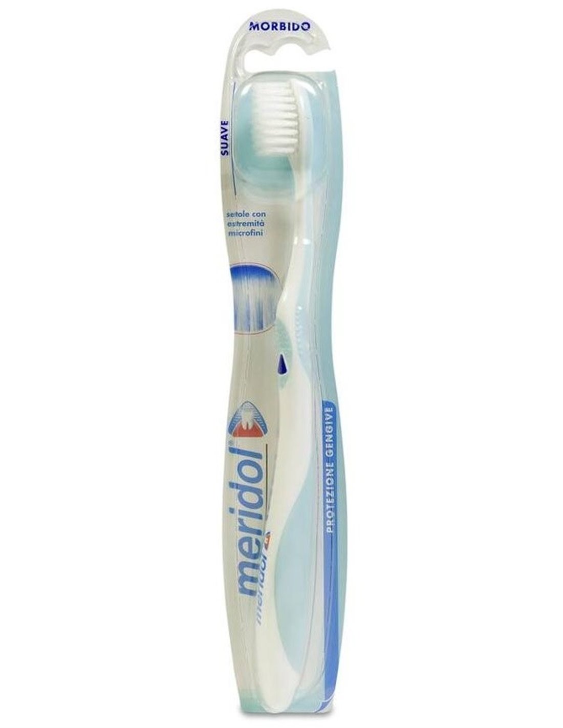 El cepillo de dientes meridol® Suave está diseñado para personas con enfermedades gingivales o riesgo de padecerlas. Tiene filamentos cónicos con extremos microfinos para proteger las encías mientras limpia a fondo todos los dientes, especialmente alrededor de la línea de las encías.