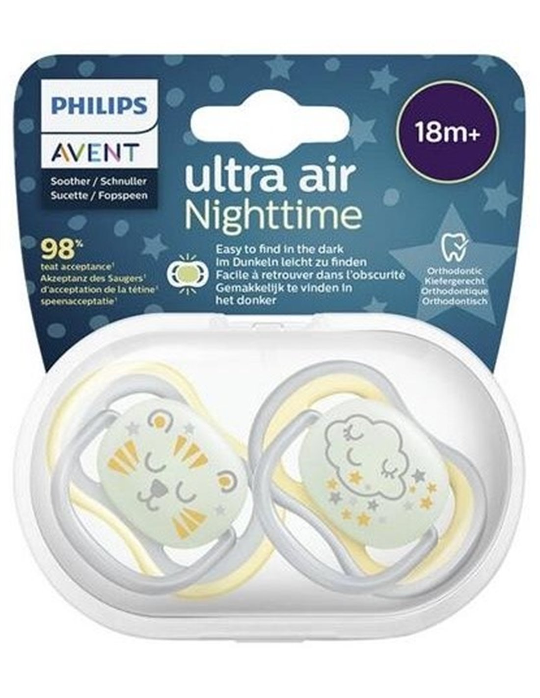 Philips Avent Ultra Air Nighttime Chupete +18m 2uds es un chupete diseñado para bebés a partir de los 18 meses.