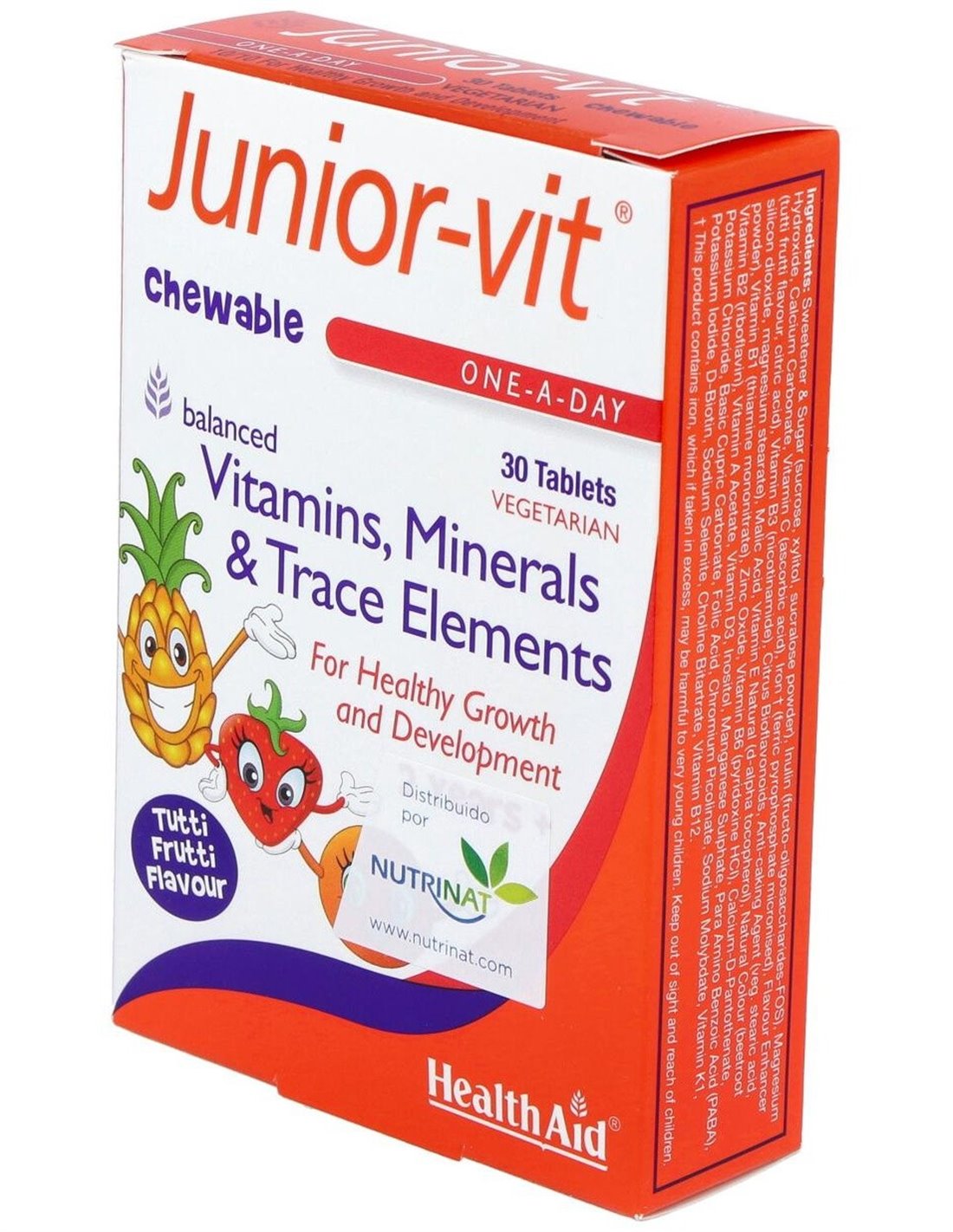El Junior Vit 30Comp. Health Aid es un suplemento vitamínico para niños que contribuye al bienestar general, formulado con nutrientes esenciales para apoyar su desarrollo diario.