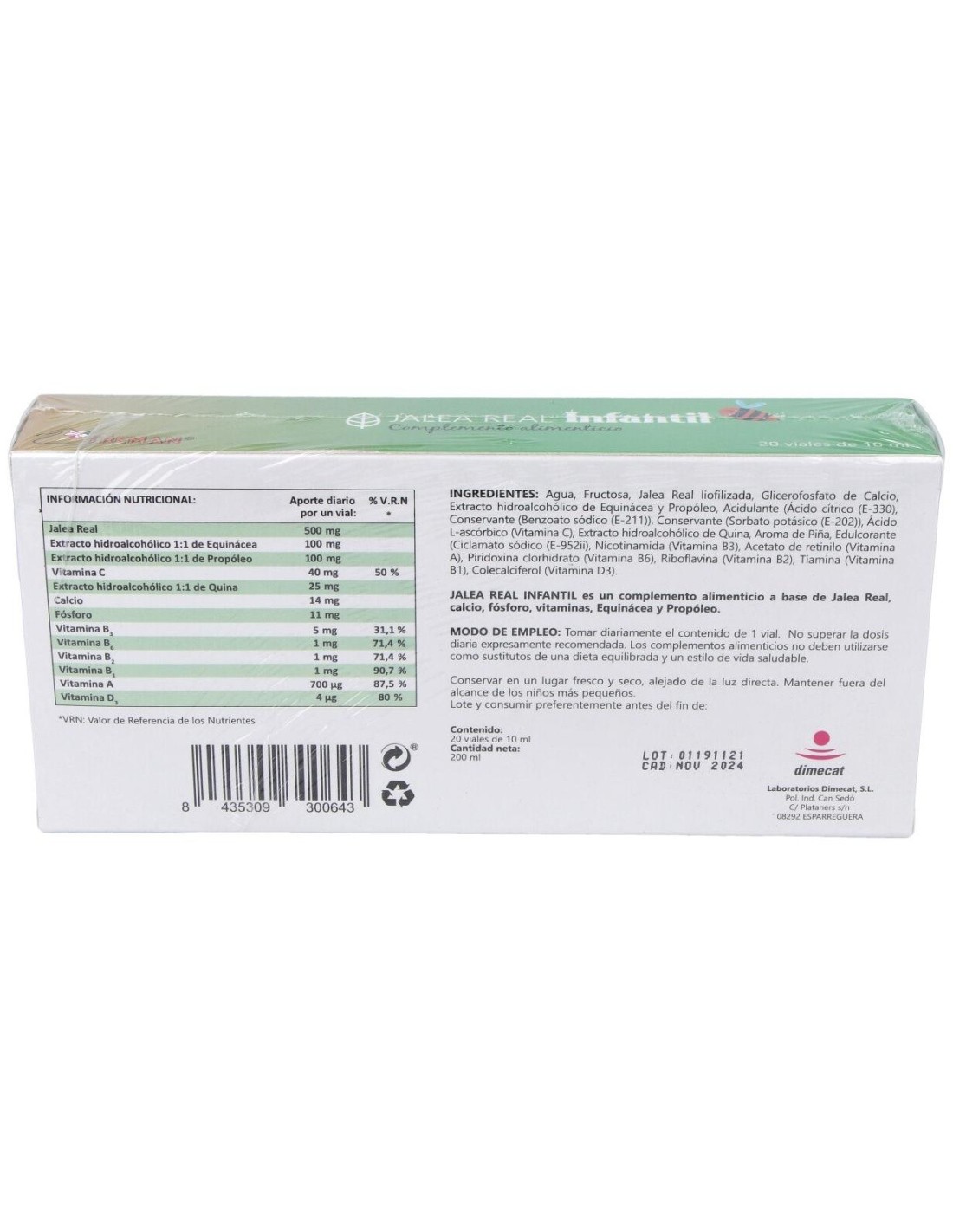 Por 1 Ampolla: Jalea Real 500mg, Propóleo 100mg, Echinacea 100mg, Glicerofosfato Cálcico 100mg, Acerola 40mg, Vitamina A 400mg, Vitamina D 5mg, Edulcorante, Aromatizante Y Agua Purificada.