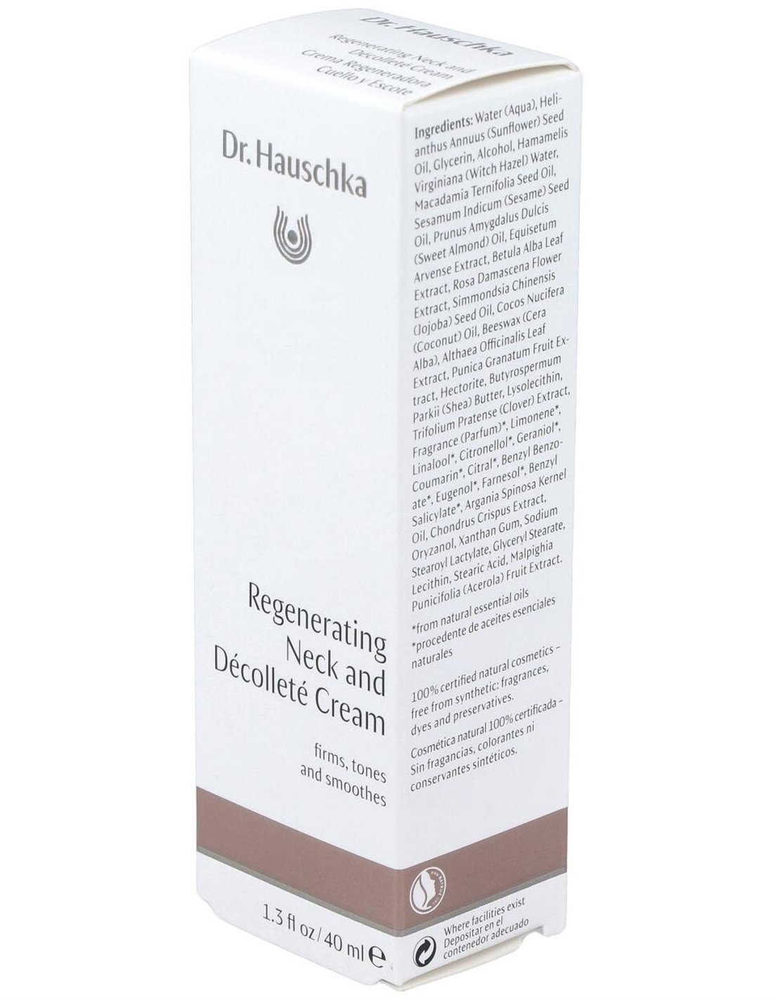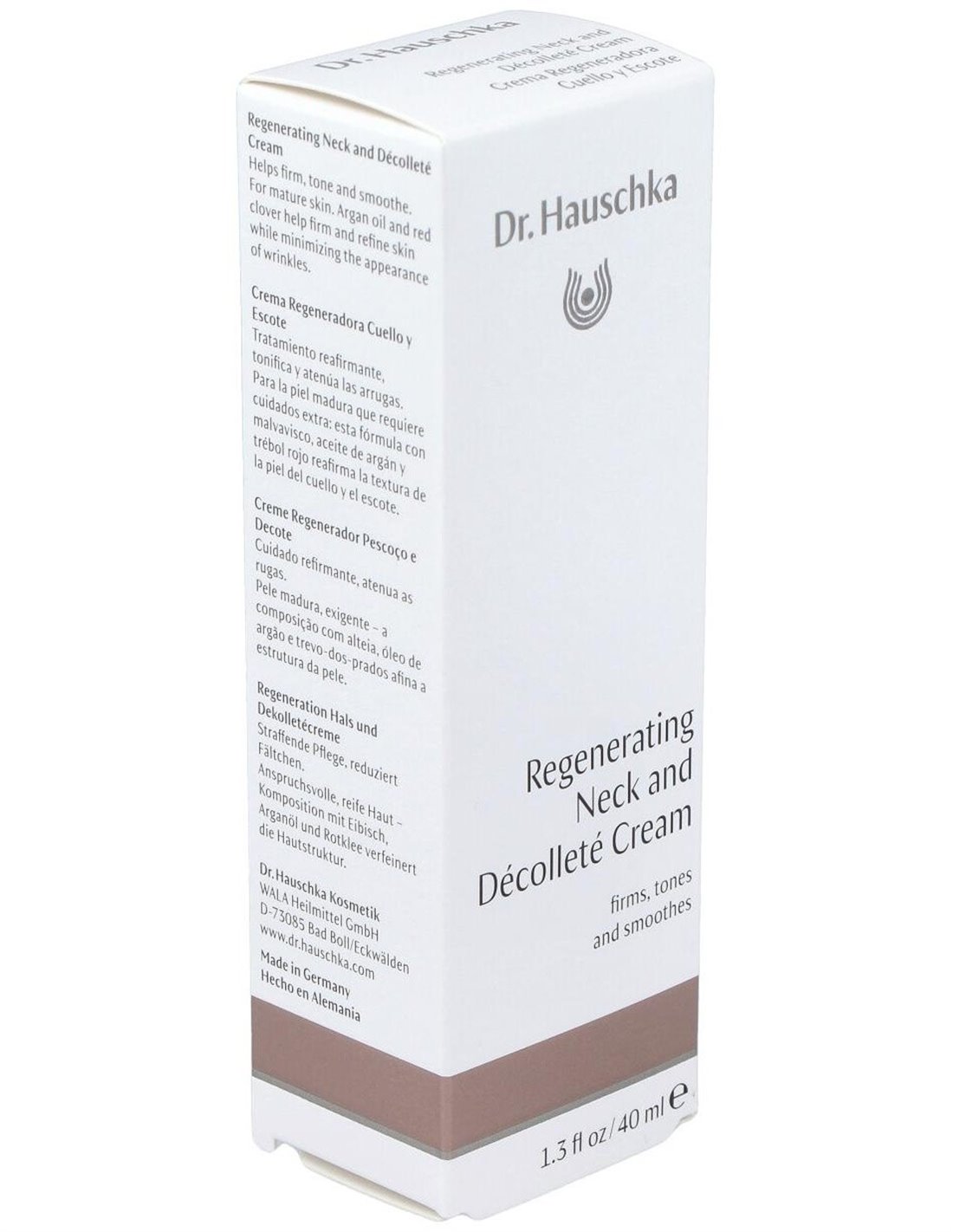 Dr. Hauschka Crema Regeneradora Cuello y Escote 40ml revitaliza la piel y estimula su capacidad regeneradora natural. Formulada especialmente con Malvavisco, Hojas de Abedul, Trébol rojo, Aceite de Nuez de Macadamia y Aceite de Argán. Nutre intensamente la piel y tiene efecto reafirmante.