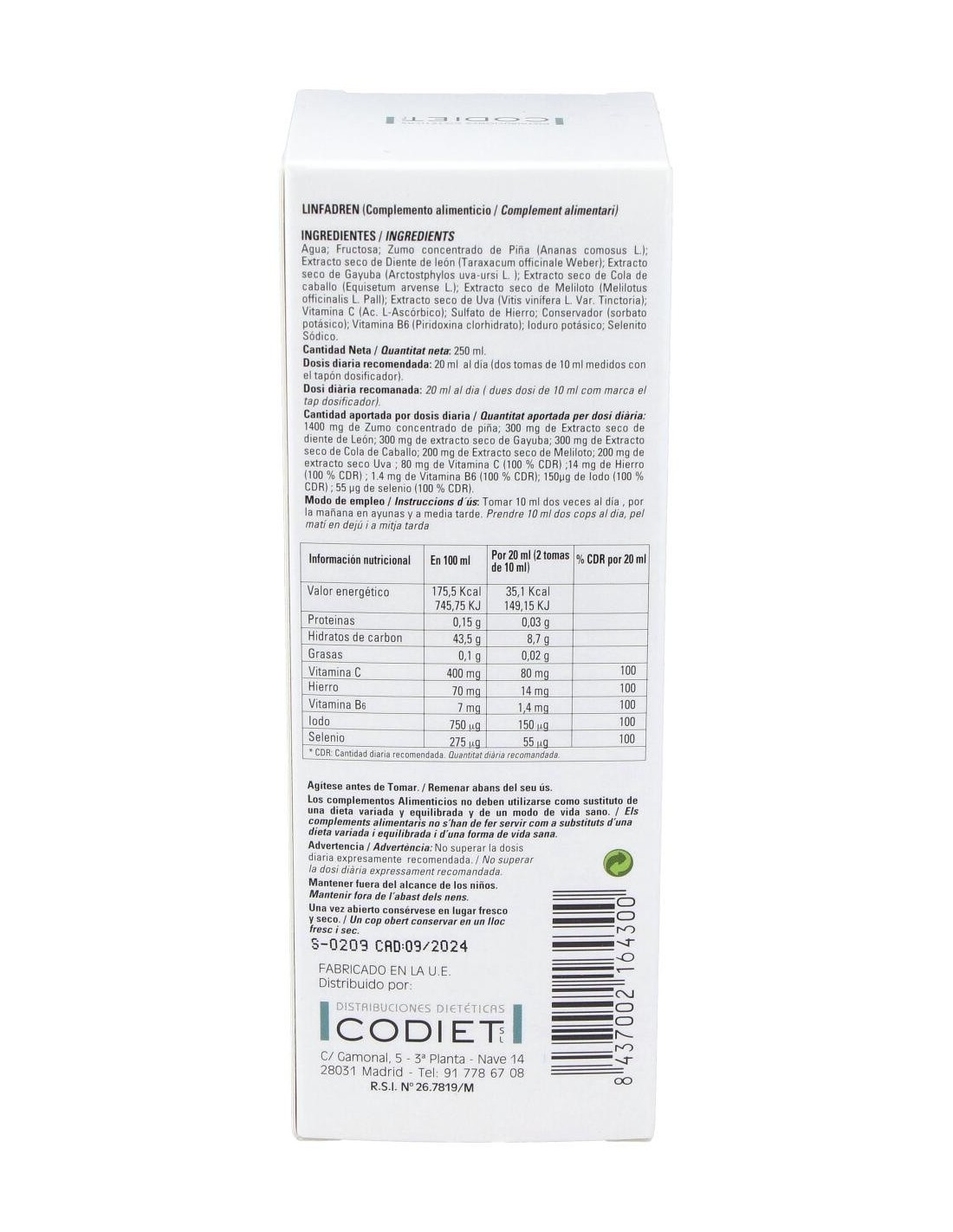 Complemento alimenticio presentado en líquido que actúa como drenador linfático y de desechos del metabolismo celular, drenador hepato-biliar, retención de líquidos, diurético, coadyuvante en tratamientos para varices. Así mismo es astringente, antidiarréica, hemostática y antiinflamatoria, y es adecuado en uso externo para luchar en inflamaciones bucales y oculares, y sobre heridas cutáneas.