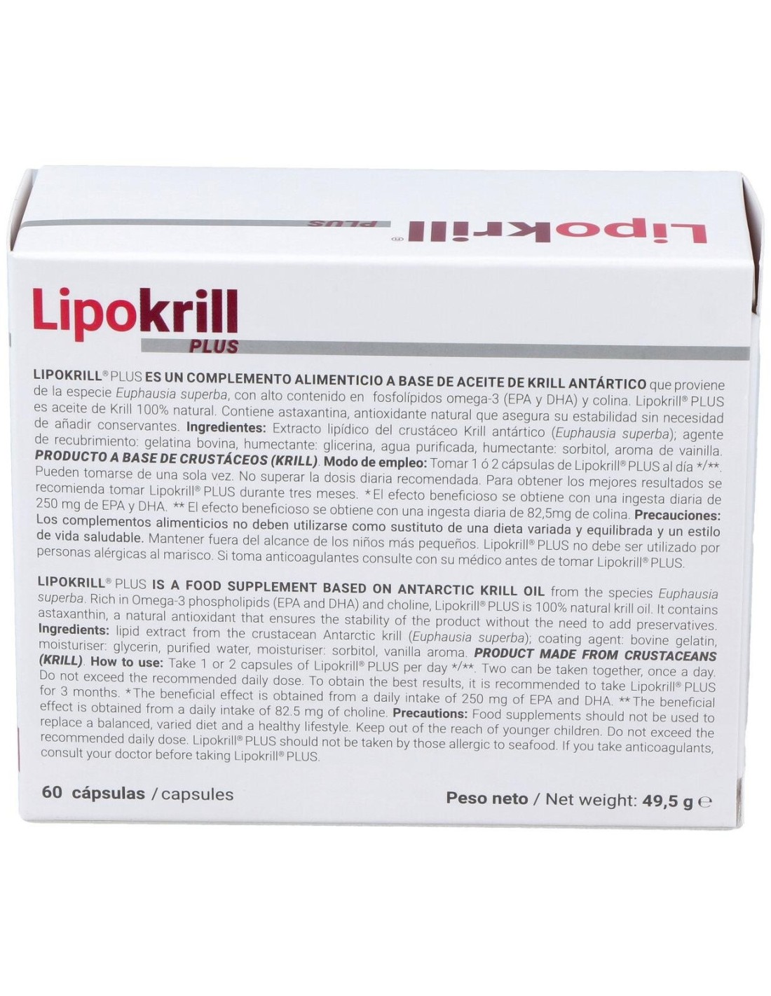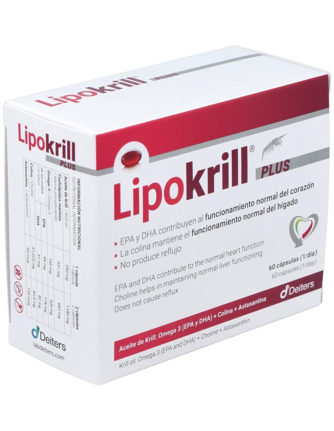 100% aceite de Krill con un alto contenido en fosfolípidos de omega-3 (EPA y DHA) que contribuyen al funcionamiento normal del corazón, a mantener niveles normales de triglicéridos en sangre y a mantener la presión arterial normal. Además gracias a la colina presente en el aceite de Krill, contribuye al metabolismo normal de los lípidos y al funcionamiento normal del hígado. Sin olor ni sabor.