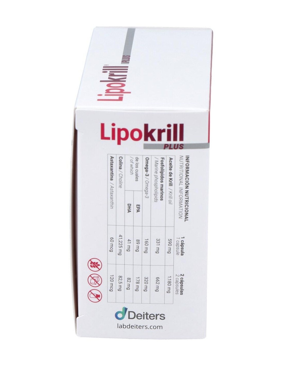 100% de aceite de Krill Antártico ccon un alto contenido en fosfolípidos de Omega-3 eicosapentaenoico (EPA) y docosahexaenoico (DHA) y Colina, Astaxantina.