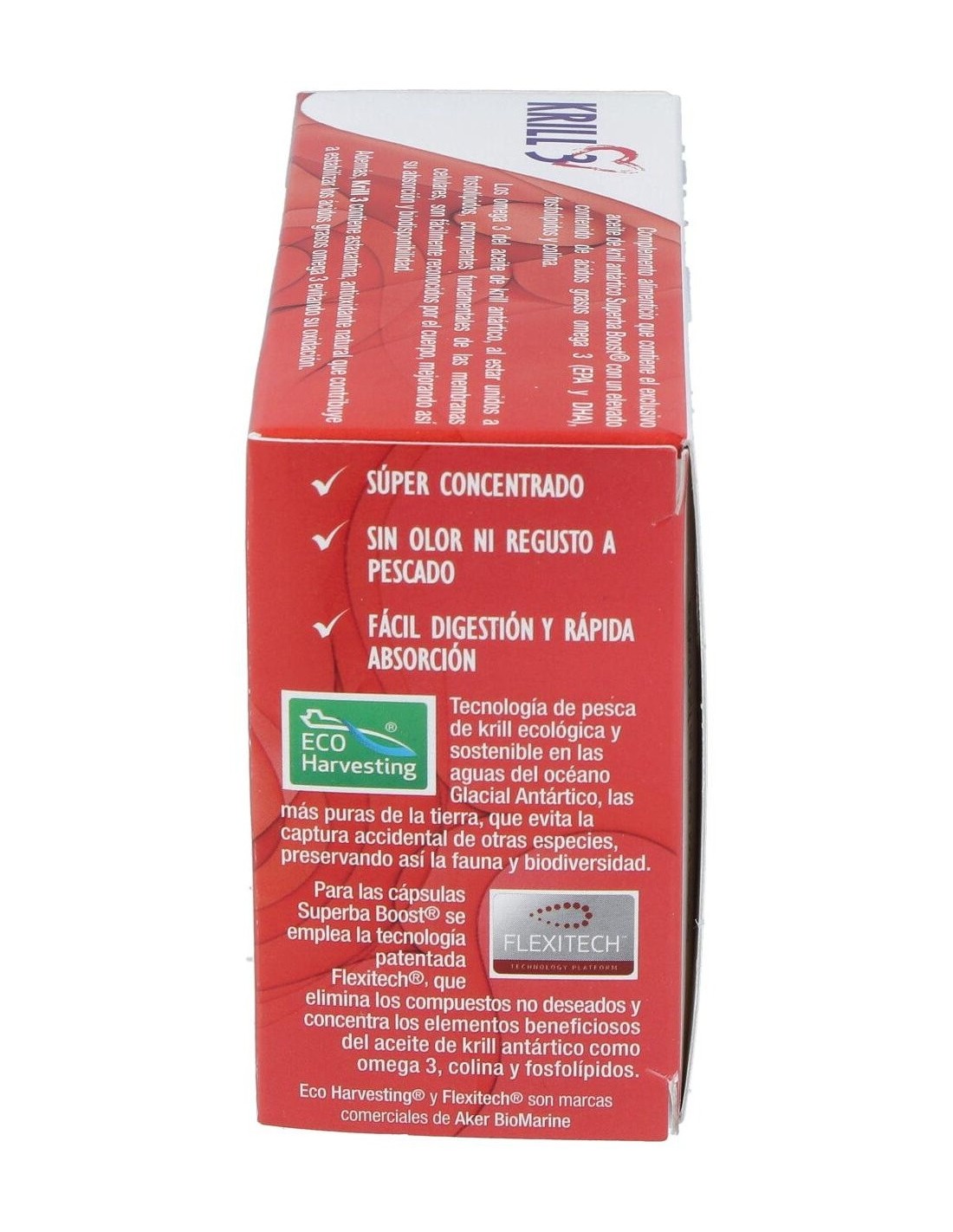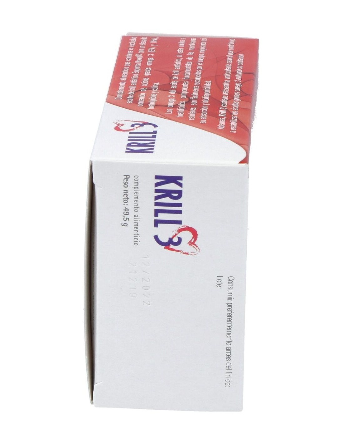 El complejo Krill 3 ayuda a regular y mantener el correcto equilibrio de los ácidos grasos esenciales y triglicéridos en nuestro organismo. Su composición, rica en fosfolípidos, favorece la asimilación a nivel intestinal y la incorporación directa en las membranas celulares de los omega 3 (EPA y DHA) tan beneficiosos para el bienestar y la salud humana. La presencia de astaxantina, un potente antioxidante natural, ejerce la doble función de protegernos de los radicales libres y de actuar en forma sinérgica con los omega 3 en el control de los niveles plasmáticos de colesterol, triglicéridos y glucosa. ¿Qué es el krill?El krill (euphasia superba) es un pequeño crustáceo parecido al camarón que se encuentra en las aguas del Oceáno Antártico donde se alimenta de fitoplancton. Tiene un papel clave en el ecosistema de la zona, pues representa el alimento de focas, pingüinos, peces, cefalópodos y sobre todo ballenas. A pesar de su reducido tamaño representa la mayor biomasa del planeta. Se estima que su peso puede ser de 400 millones de toneladas. Debido a su posición en la cadena alimenticia y la elevada pureza del ecosistema marino polar, el krill es una fuente puera de ácidos grasos esenciales (principalmente omega 3) sin metale spesados, toxinas u otros contaminantes. Estas propiedades nutritivas se conservana la perfección gracias al empleo de un nuevo sistema de pesca llamdo "Eco-Recolección", donde un flujo de agua mantiene vivo y fresco el krill hasta las instalaciones de procesamiento que se encuentran en el buque factoría, evitadno así su degradación y proporcionando la mejor calidad del producto disponible en el mercado. Pesca Sostenible.Las capturas de krill utilizado para la obtención de Krill 3 se realizan con el apoyo de instituciones internacionales sin fines de lucro como el "Fondo Mundial para la Naturaleza (WWF)" y la "Comisión para la Conservación de los Recursos Marinos Antárticos (CCA-MLR)", para que se realicen siempre respetando la premisa de sostenibilidad ambiental. Además, el sistema de pesca "Eco-Recolección" evita la captura accidental de aves o mamiferos marinos. Ingredientes por perla:
