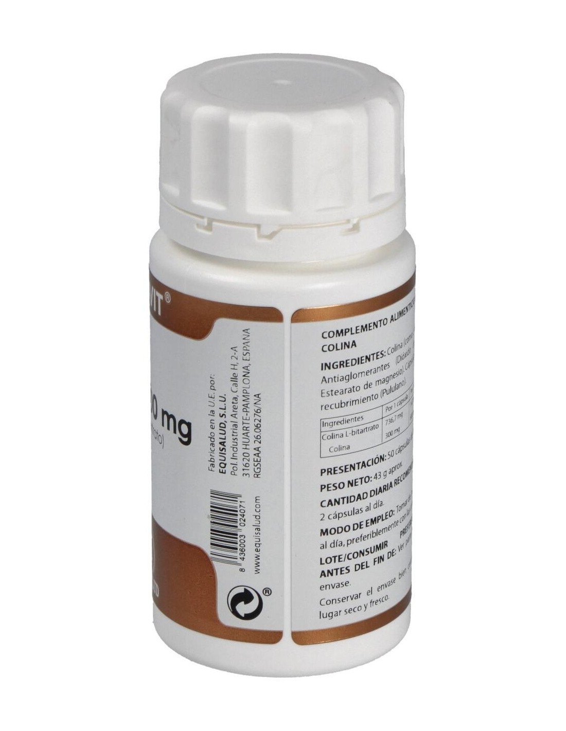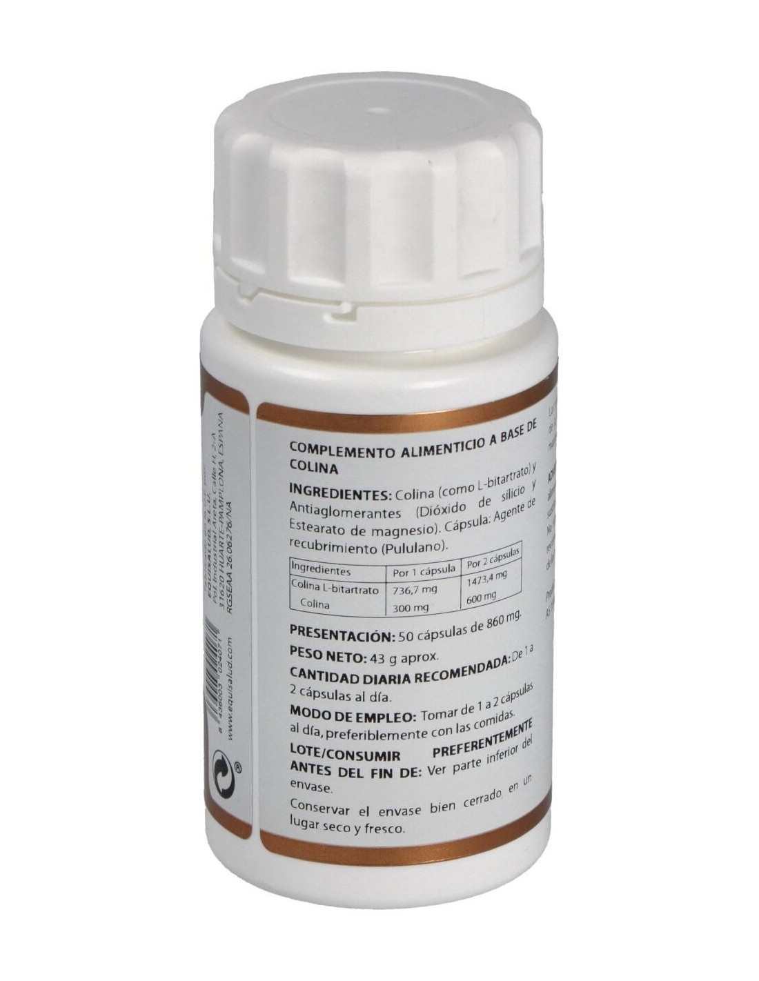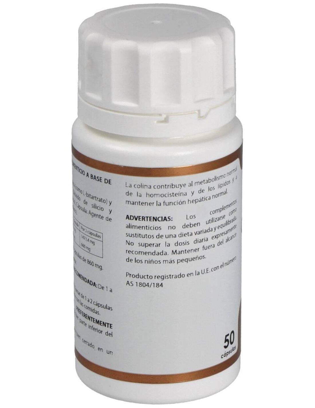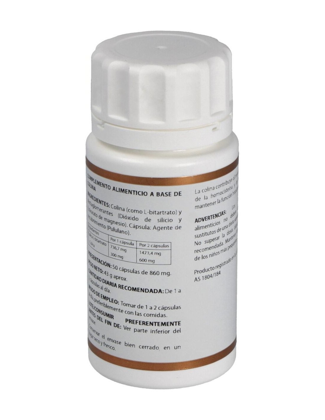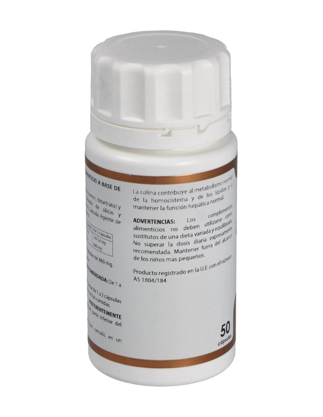 La colina contribuye al metabolismo normal de la homocisteína y de los lípidos y a mantener la función hepática normal.Ingredientes activos por cápsula:736,7 mg de colina L-bitartrato recubierta (aporta 300 mg de colina).Modo de empleo:Tomar de 1 a 2 cápsulas al día, preferiblemente con las comidas.Presentación:Bote de 50 cápsulas.