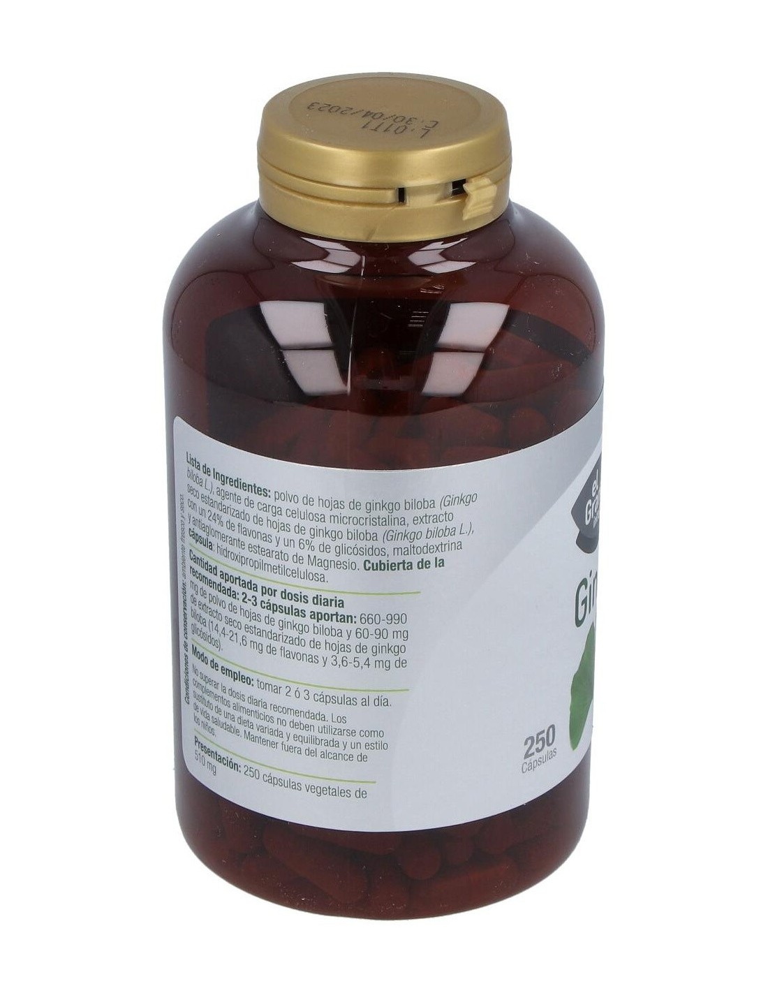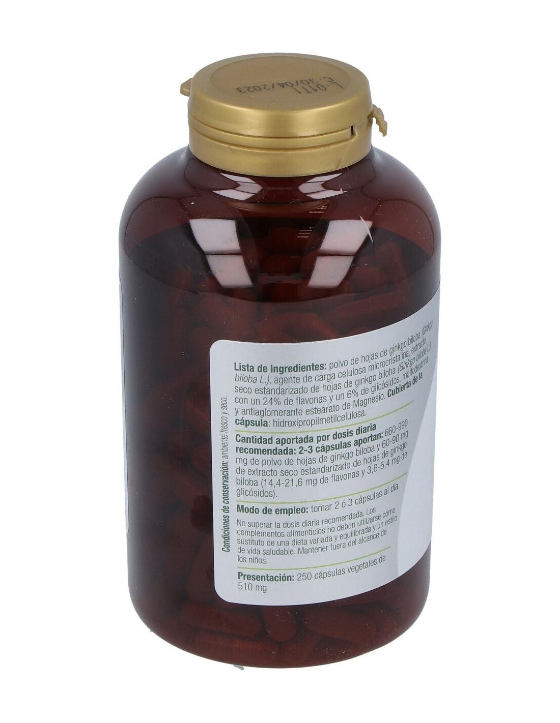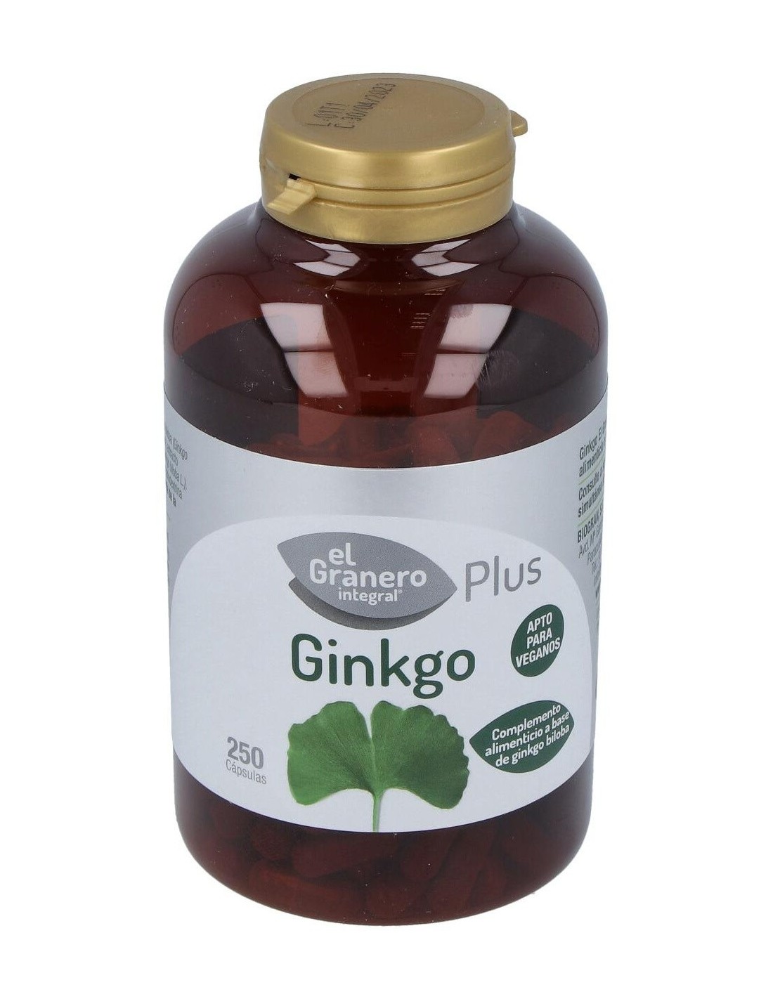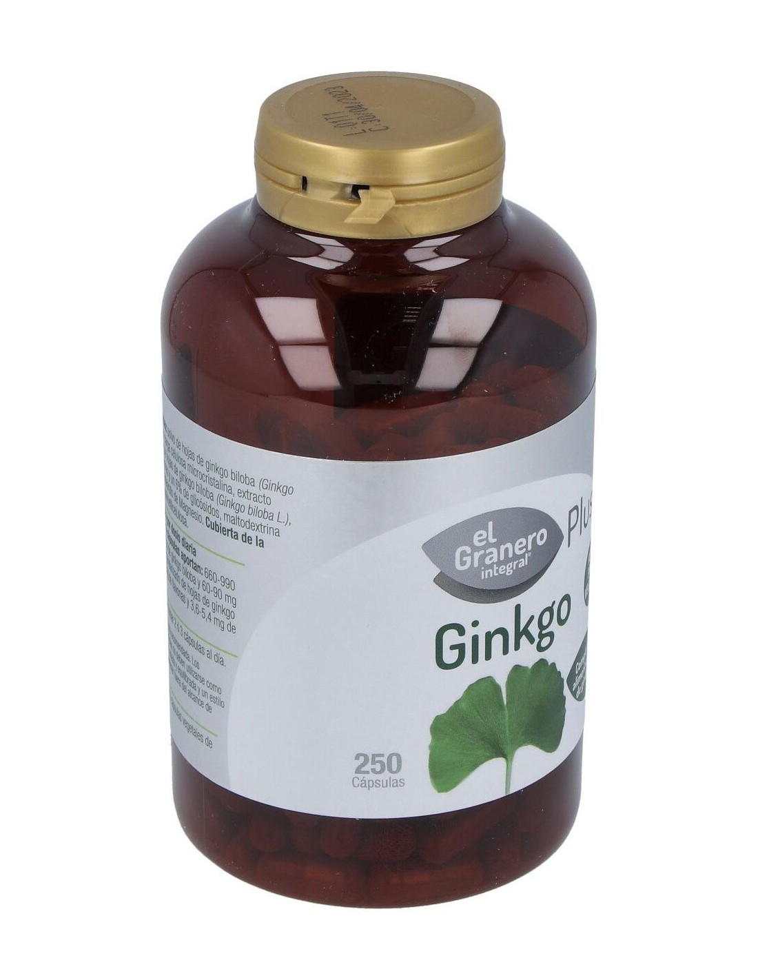 Composición:Polvo de hojas de ginkgo biloba (Ginkgo biloba L.), agente de carga celulosa microcristalina, extracto seco estandarizado de hojas de ginkgo biloba (Ginkgo biloba L.), con un 24% de flavonas y un 6% de glicósidos y antiaglomerante estearato de Magnesio. Cubierta de la cápsula: espesante hidroxipropilmetilcelulosa. Modo de empleo:Tomar de 2 a 3 cápsulas al día. Presentación:Bote de 250 cápsulas. Precauciones: