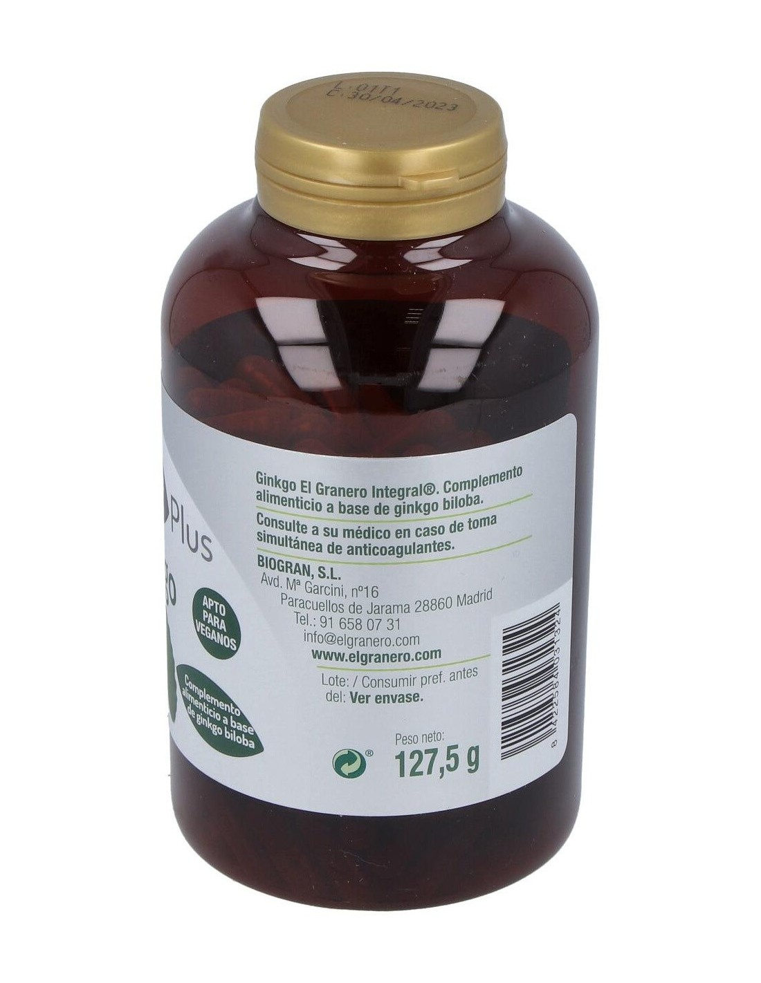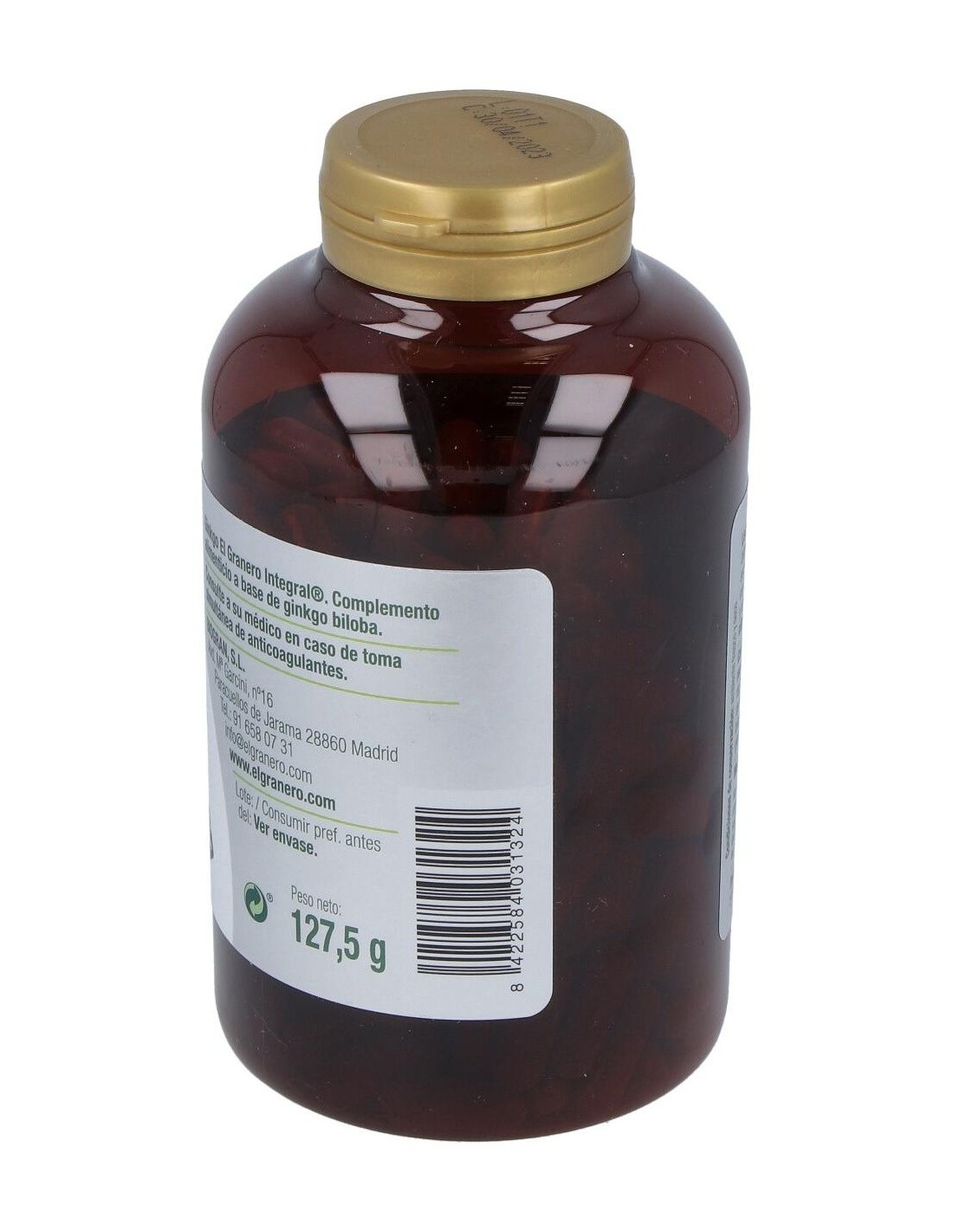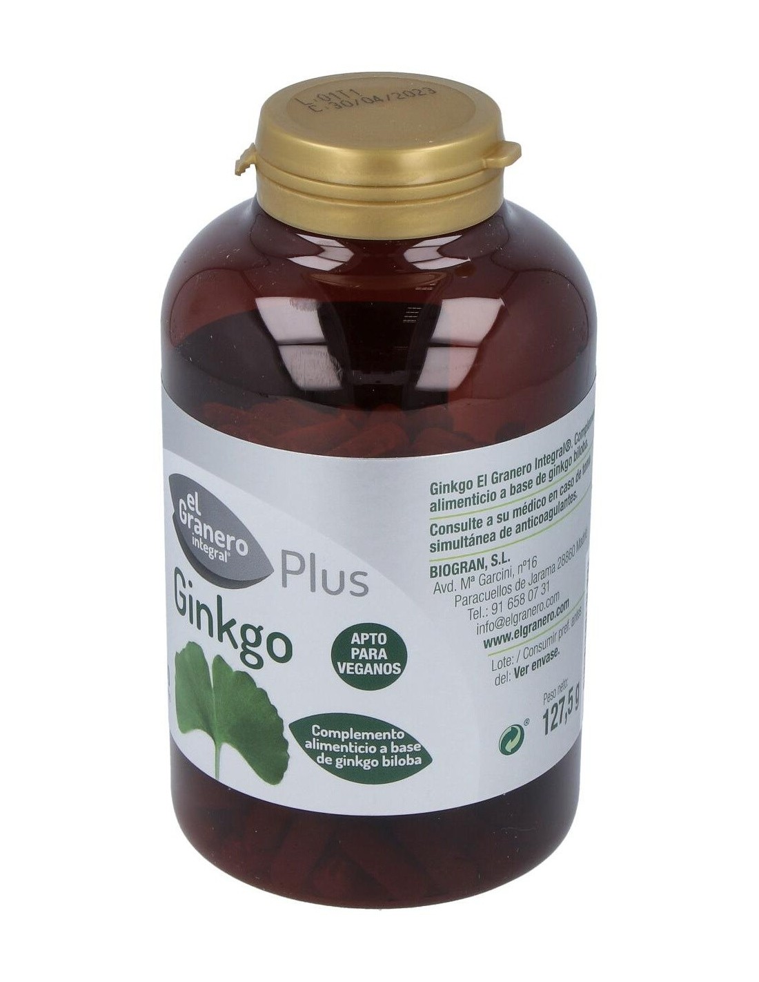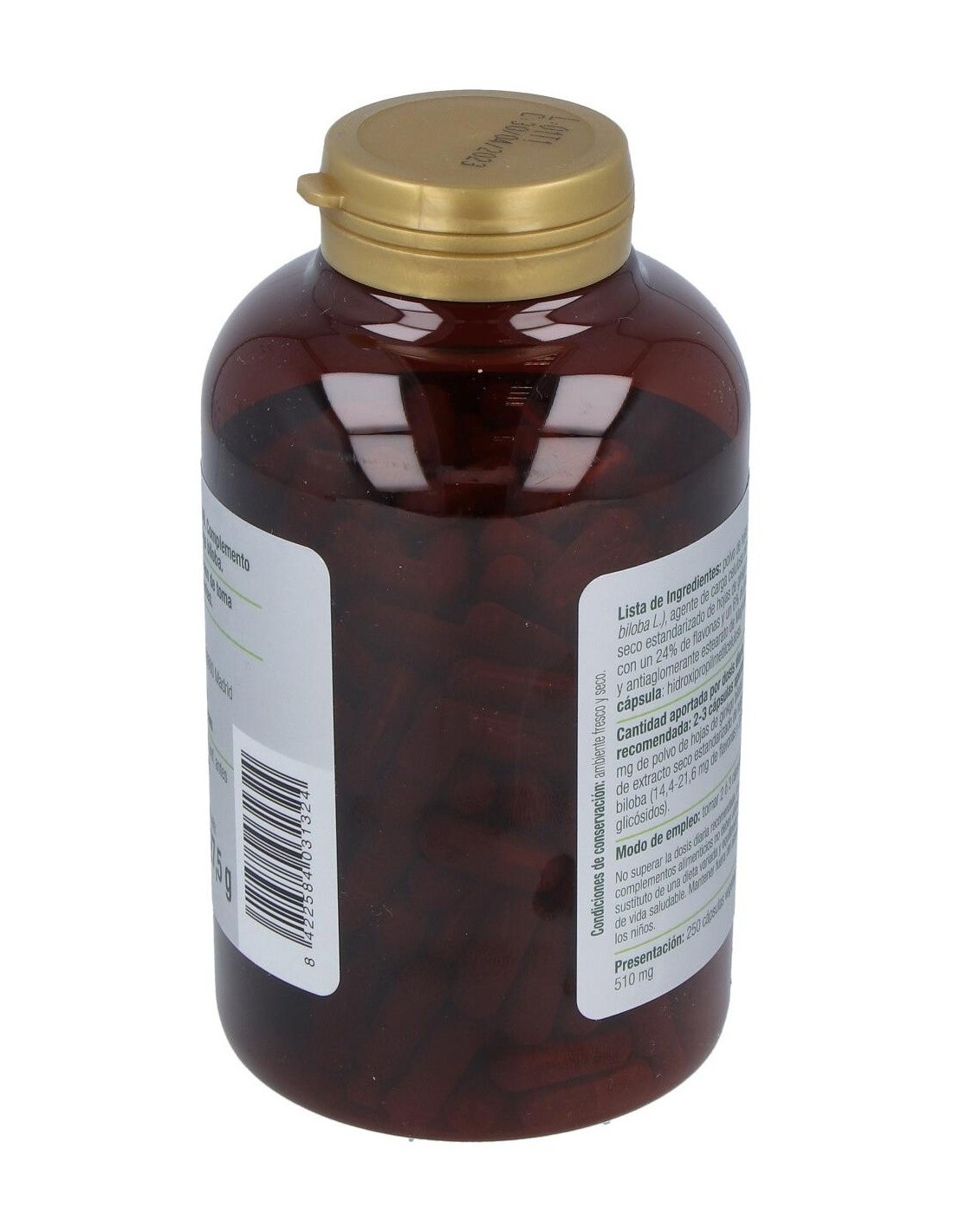 Composición:Polvo de hojas de ginkgo biloba (Ginkgo biloba L.), agente de carga celulosa microcristalina, extracto seco estandarizado de hojas de ginkgo biloba (Ginkgo biloba L.), con un 24% de flavonas y un 6% de glicósidos y antiaglomerante estearato de Magnesio. Cubierta de la cápsula: espesante hidroxipropilmetilcelulosa. Modo de empleo:Tomar de 2 a 3 cápsulas al día. Presentación:Bote de 250 cápsulas. Precauciones: