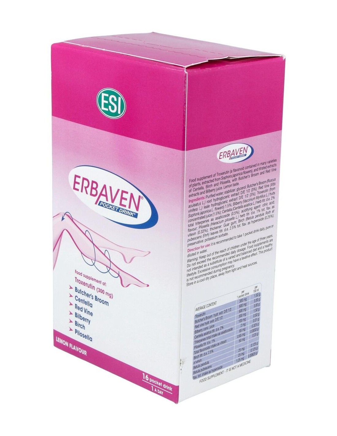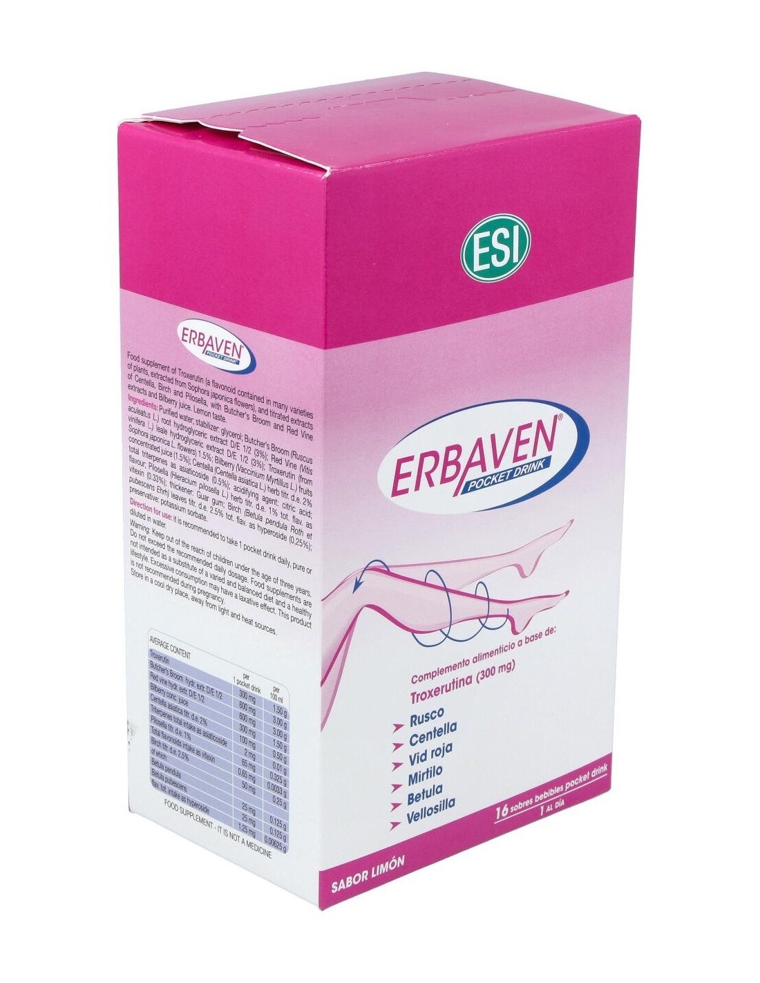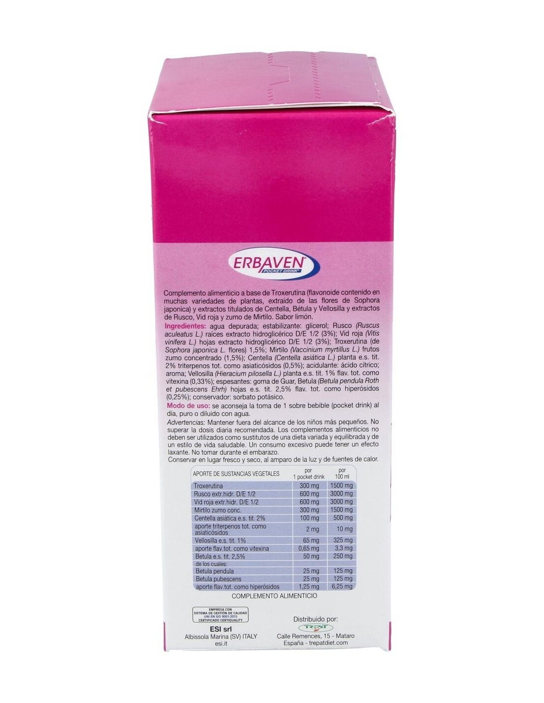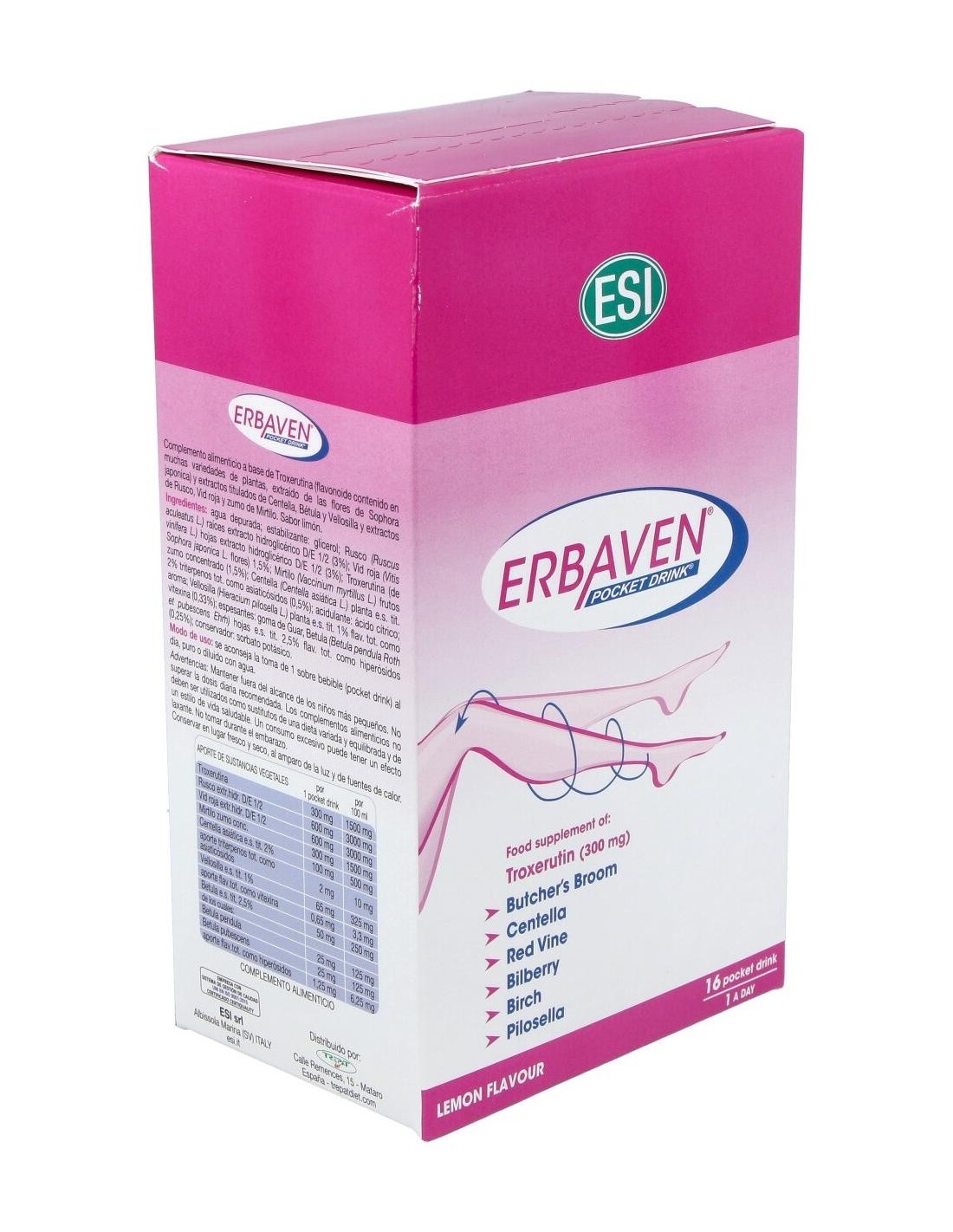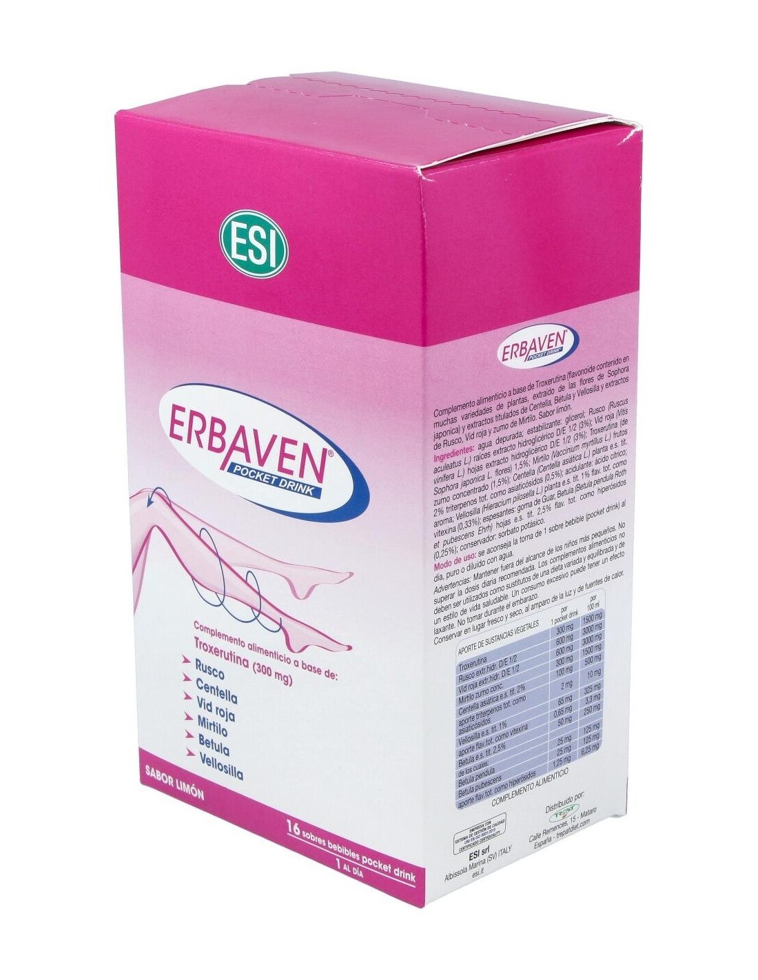 Erbaven Pocket Drink 16Sbrs. de Trepatdiet-Esi es un complemento alimenticio para personas que buscan apoyar la salud circulatoria, formulado con ingredientes que contribuyen al bienestar vascular de forma práctica y portátil.