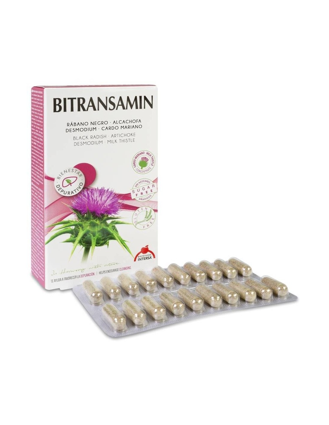 Bitransamin es un producto estudiado para regular la función hepato-biliar y disminuir específicamente los niveles de transaminasas. La fórmula posee diferentes efectos sobre el sistema hepatobiliar: hepatoprotector, regulador de los niveles de transaminasas, regenerador de la célula hepática, detoxificante, hemostática o antihemorrágica, coletérica y colagoga. Tradicionalmente se ha utilizado para: transaminasas elevadas, hepatitis, colelitiasis, cirrosis hepática, digestiones lentas, indigestibilidad de las grasas, hígado graso, sobrecarga hepática, hiperolesterolemia e hipertrigliceridemia, intoxicaciones. Ingredientes:maltodextrina de maíz (incrementador de volumen); gelatina; extracto seco de hojas de alcachofa (Cynara scolymus L.), 76,5 mg/cáp.; extracto concentrado de raíz de rábano negro (Raphanus sativus var. niger L.), 46 mg/cáp.; extracto concentrado y polvo de hojas de Desmodium (Desmodium adscendens L.), 46 mg/cáp.; extracto seco de frutos de cardo mariano (Silybum marianum L.), 22 mg/cáp.; sílice coloidal (antiaglomerante); estearato de magnesio (antiaglomerante).Modo de empleo:Tomar de 1 a 3 cápsulas al día.Presentación:Envase de 60 cápsulas.Recomendación y advertencias:No contiene gluten ni azúcar.