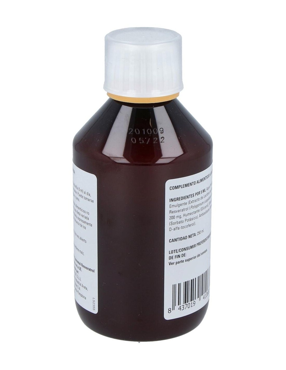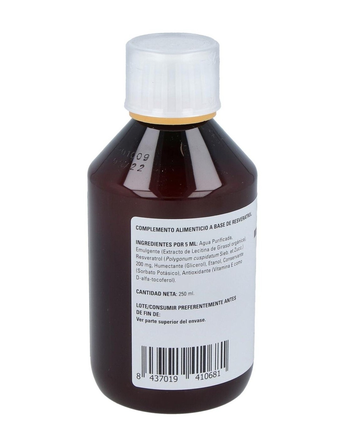 Ingredientes por 5 ml: agua purificada, emulgente (lecitina de girasol orgánica), etanol, conservante (sorbato potásico), resveratrol (Polygonum cuspidatum Sieb. Et Zucc.), 200 mg; humectante (glicerol), antioxidante (vitamina E como D-alfa-tocoferol).