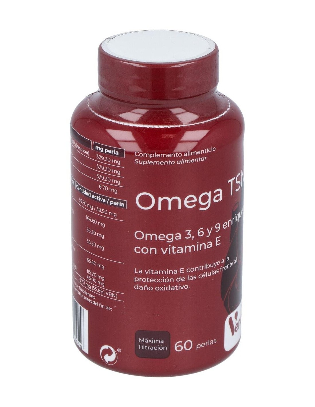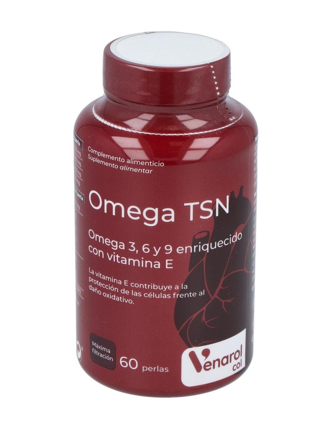 El colesterol es una sustancia grasa natural presente en todas las ce´- lulas del cuerpo humano necesaria para el normal funcionamiento del organismo. Sin embargo, cuando sus niveles en sangre se elevan pueden producir problemas cardiovasculares.Omega TSN aporta a´cidos grasos poliinsaturados omega, obtenidos de fuentes naturales, que forman parte de los elementos ma´s indis- pensables para el correcto funcionamiento del corazo´n y optimiza- cio´n en los niveles de colesterol. Dentro de estos a´cidos grasos esta´n los omega-3 y los omega-6, considerados esenciales, ya que nuestro organismo no los puede sintetizar. Otro grupo son los omega-9 (grupo del a´cido oleico), que completan una excelente fo´rmula para combatir las patologi´as cardiovasculares.Los aceites grasos de omega 3 utilizados en Omega TSN, provienen del pescado azul, concretamente de las anchoas. Gracias a la ma´xi- ma filtracio´n y taman~o del pescado utilizado, estos aceites tienen certificada su baja proporcio´n de metales pesados y contaminantes.La vitamina E liposoluble en esta fo´rmula actu´a como antioxidante, incrementando en sangre la tasa de omegas 3-6-9. Indicaciones:Mantiene un corazón sano y libre de exceso de colesterol. Composición activa por perla: