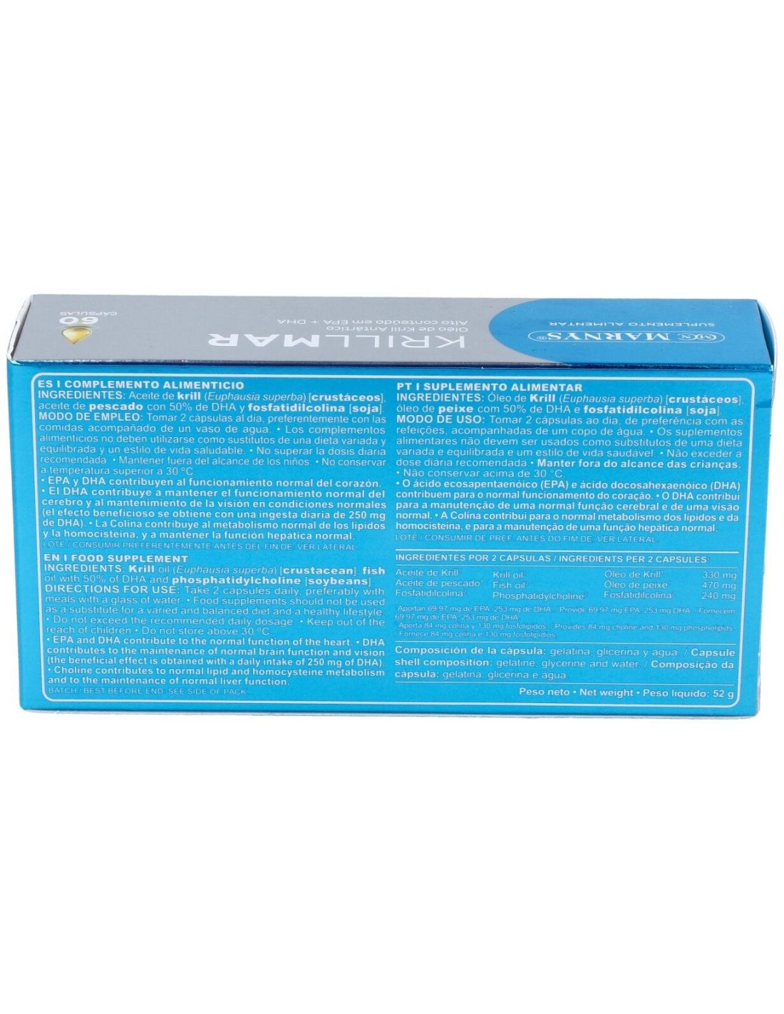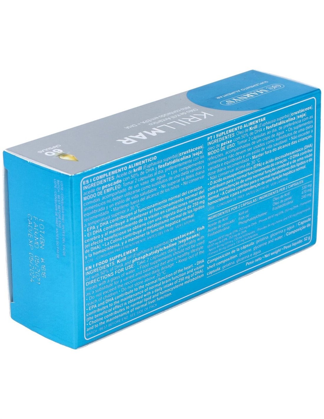 - Contiene extracto de krill, fuente natural de ácidos grasos omega-3, que contribuyen al mantenimiento de funciones corporales esenciales.
