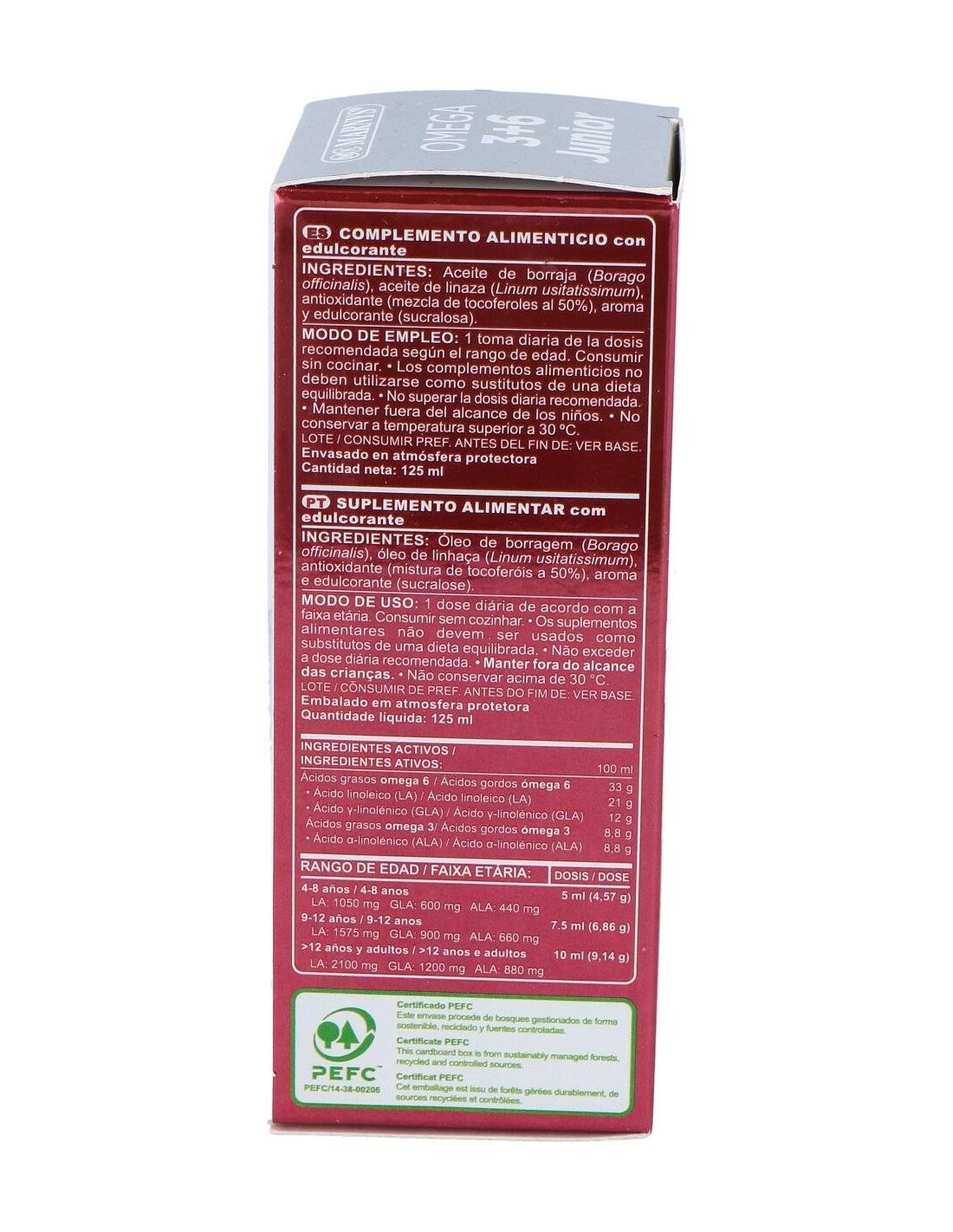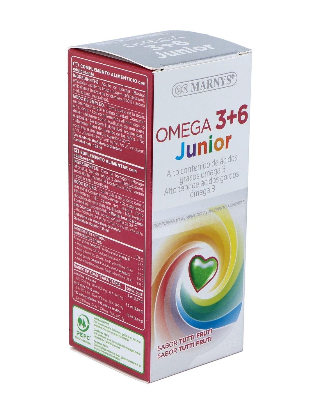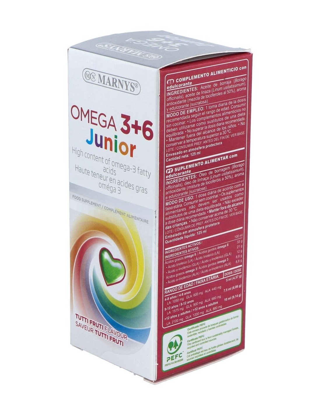 Este producto está especialmente formulado y dirigido a la población infantil para el crecimiento y el desarrollo normal en estos estadios de la vida, resultado de un cuidadoso y actualizado estudio basado en las más recientes recomendaciones y regulaciones en materia de nutrición y salud. Los ingredientes activos de Omega Junior 3&6 han sido obtenidos mediante la técnica de prensado en frío de las semillas de Borago officinalis y de Linum usitatissimumconsiguiendo un aceite puro, libre de disolventes químicos. Ingredientes por cada 5 ml: