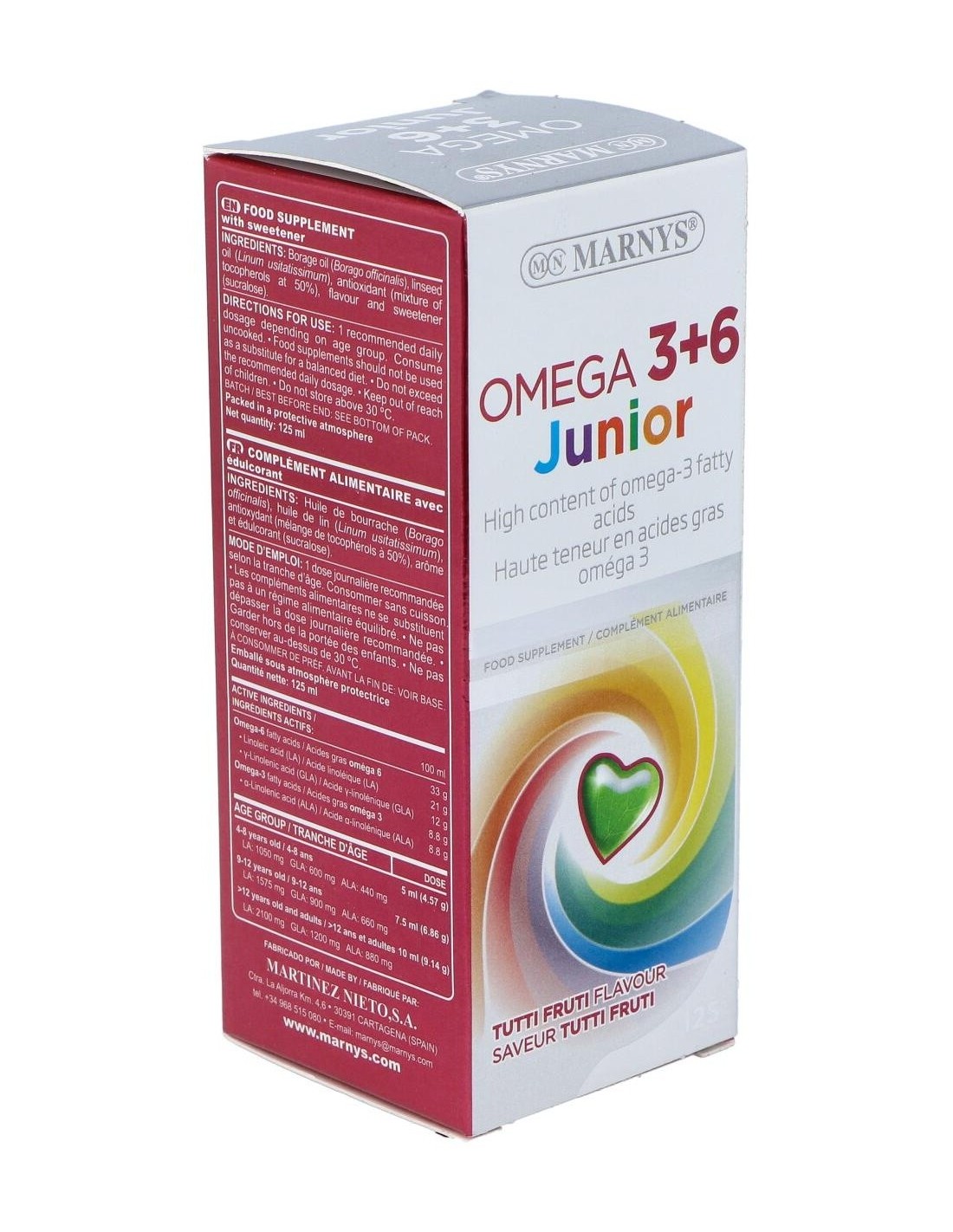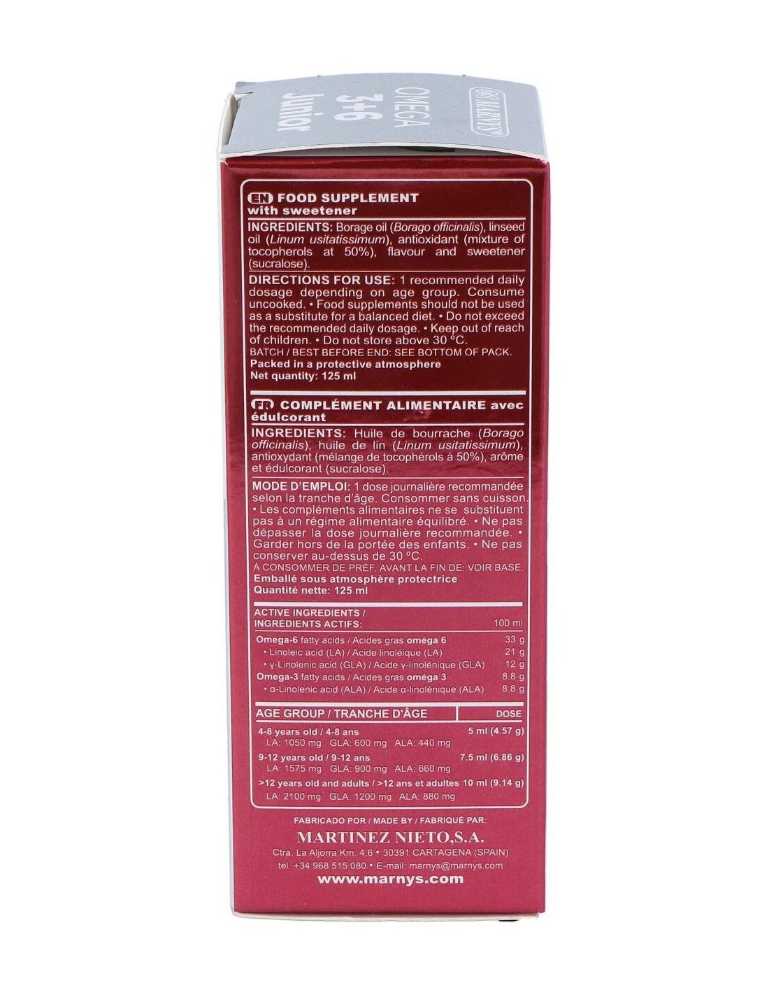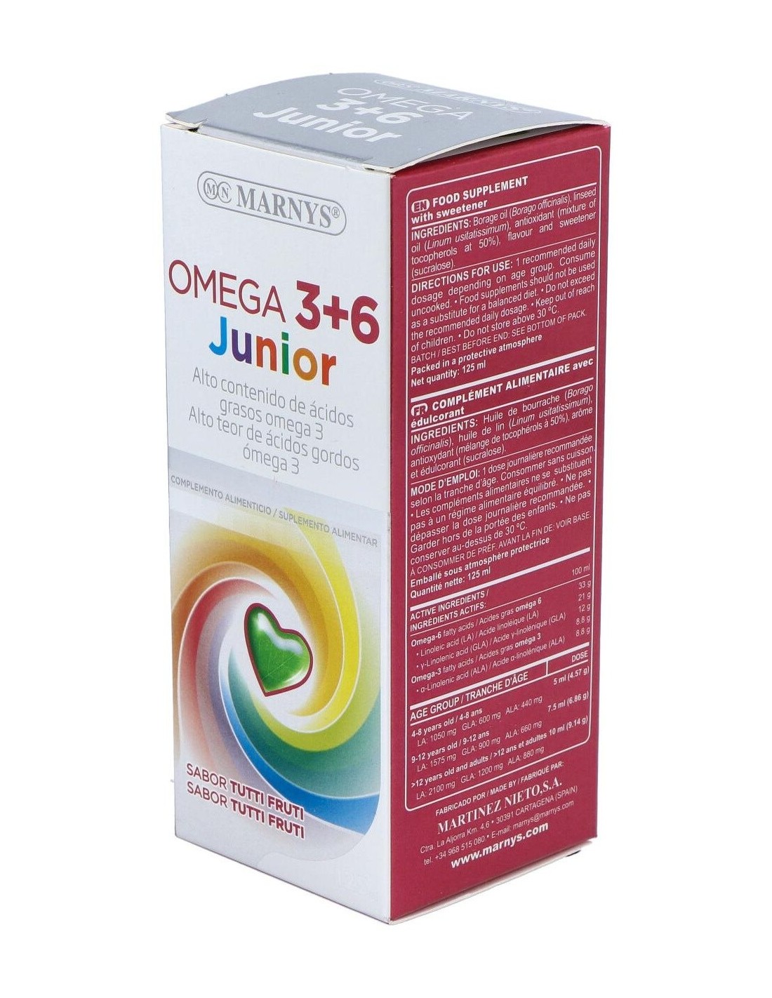Este producto está especialmente formulado y dirigido a la población infantil para el crecimiento y el desarrollo normal en estos estadios de la vida, resultado de un cuidadoso y actualizado estudio basado en las más recientes recomendaciones y regulaciones en materia de nutrición y salud. Los ingredientes activos de Omega Junior 3&6 han sido obtenidos mediante la técnica de prensado en frío de las semillas de Borago officinalis y de Linum usitatissimumconsiguiendo un aceite puro, libre de disolventes químicos. Ingredientes por cada 5 ml: