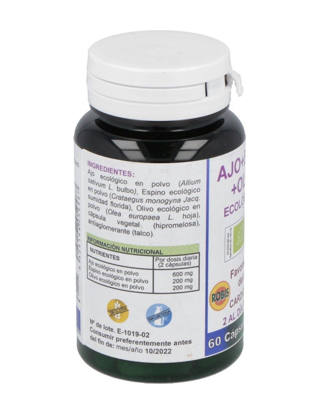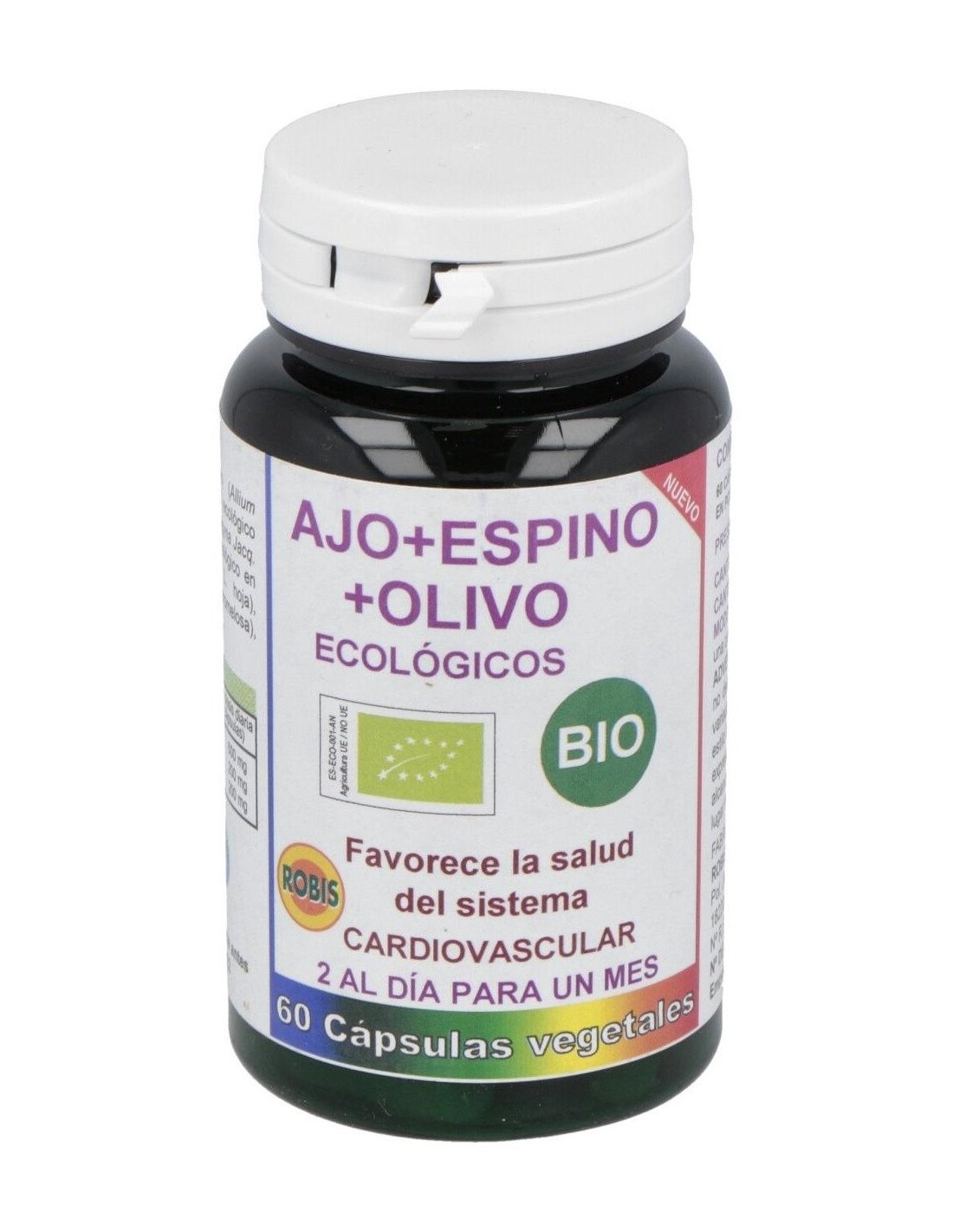 El Ajo-Espino-Olivo 60Cap. Eco de Robis es un suplemento natural para adultos que busca apoyar el bienestar cardiovascular mediante una fórmula combinada de ajo, espino y olivo.