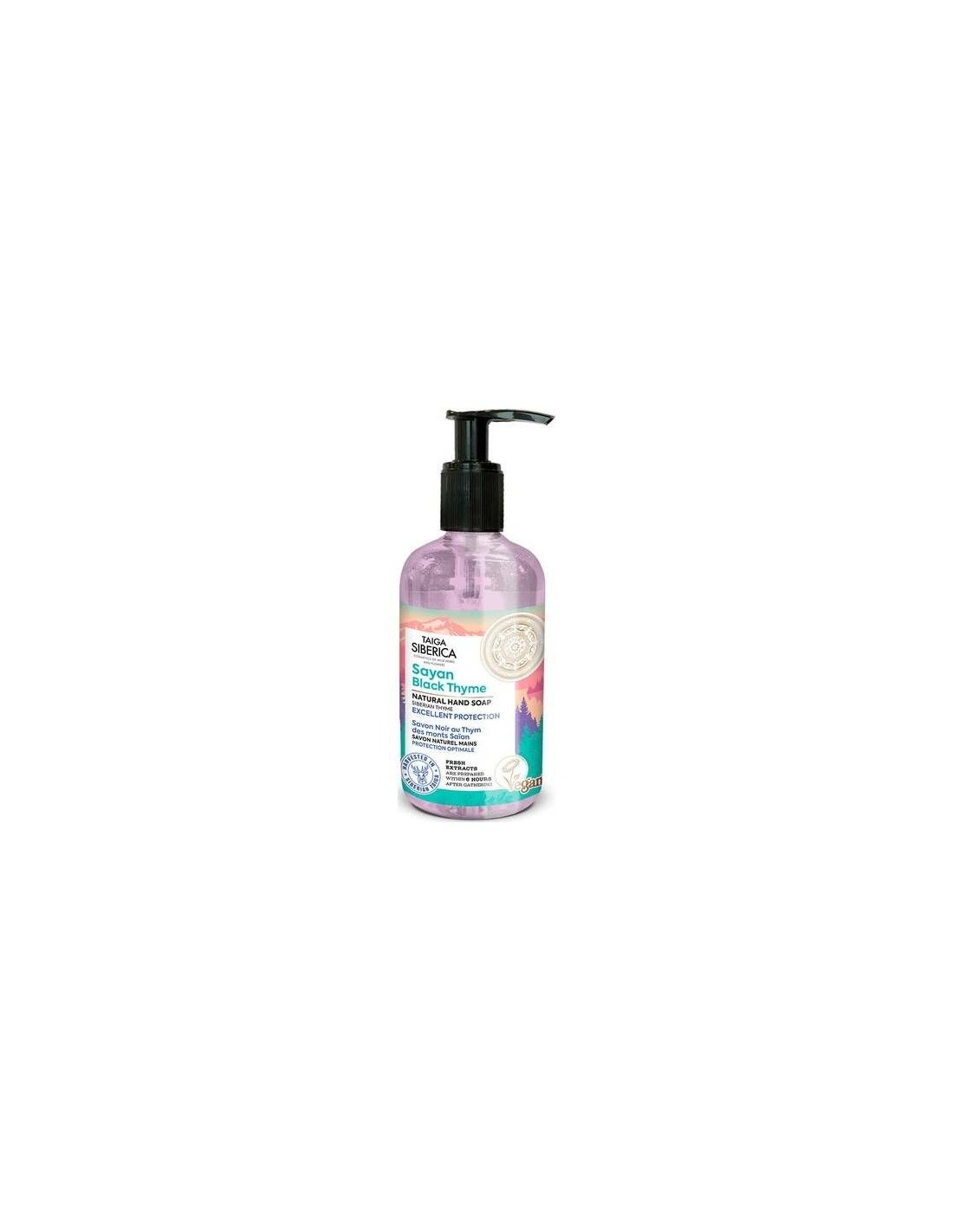 Jabón de manos con serpol negro de los montes Sayanes y una combinación de extractos de plantas de la taiga que ayuda a limpiar la piel de las manos de forma especialmente cuidadosa y eficaz mientras le otorga una protección duradera. No contiene: Parabenos, PEG, Siliconas, Fragancias Sintéticas, Tintes Sintéticos, ni Aceites Minerales. Vegano.