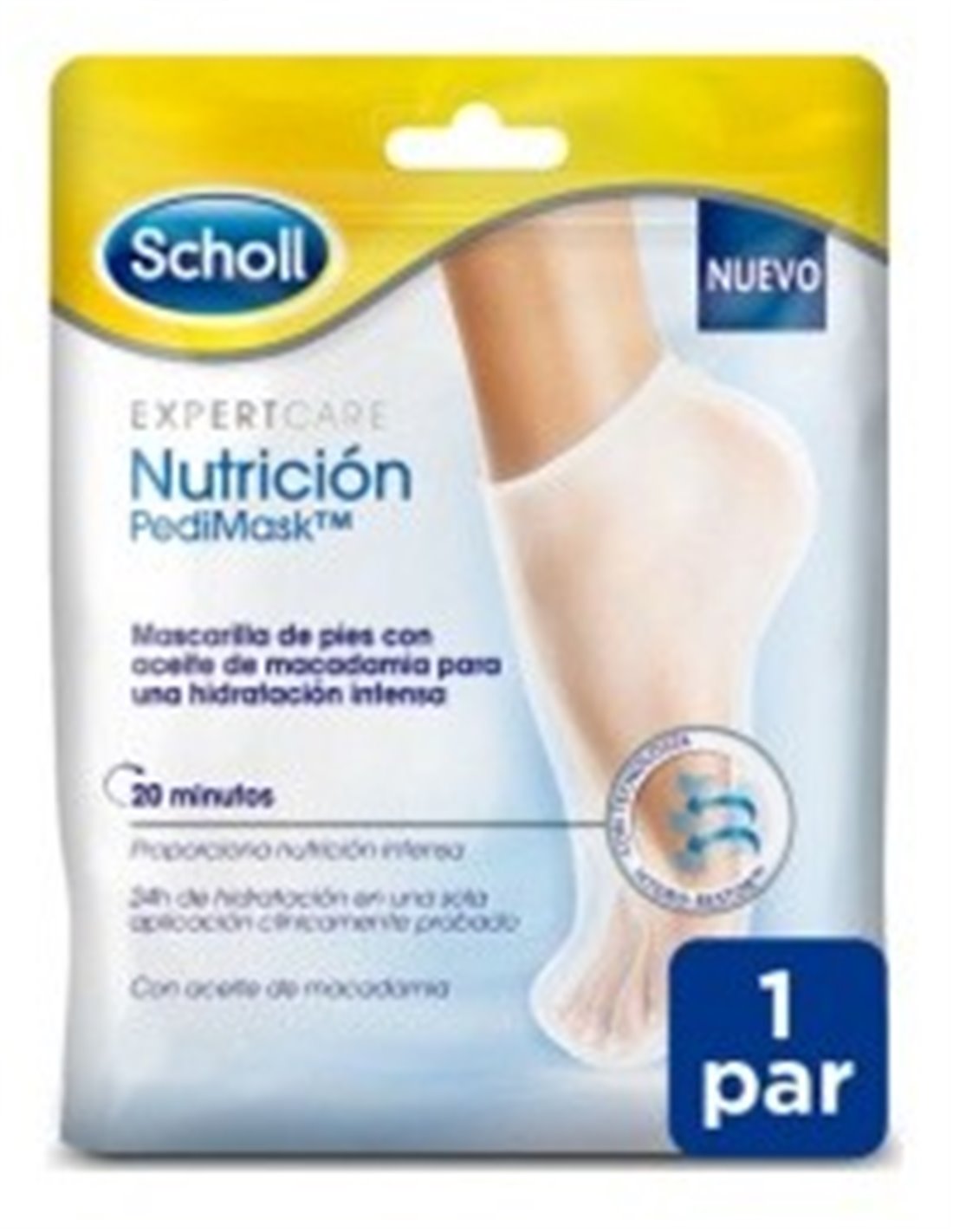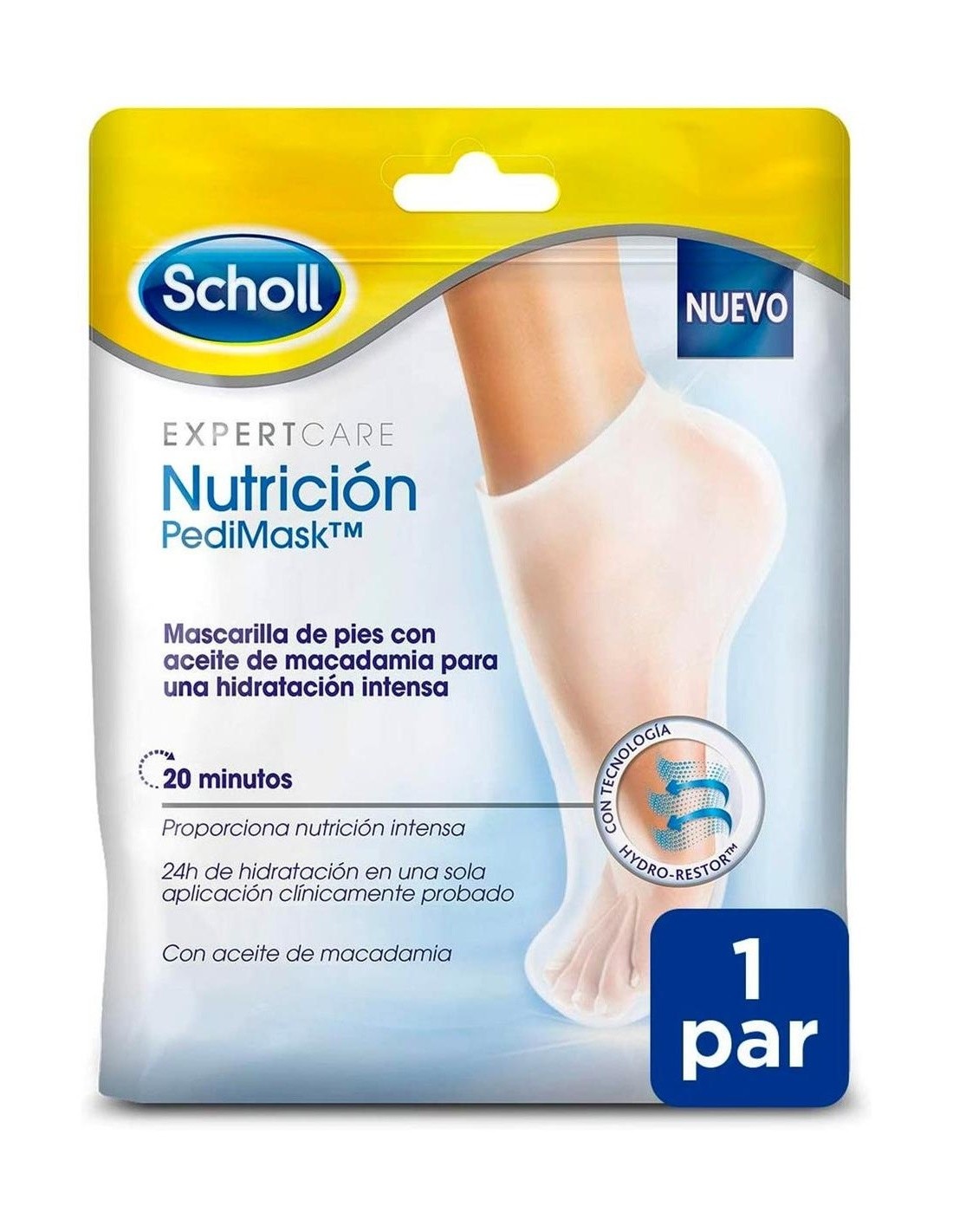 Está clínicamente probada para proporcionar hidratación intensa y duradera a los pies en tan solo 20 minutos. Consigue hasta 24 horas de hidratación en una sola aplicación gracias a la tecnología Hidro-RestoreTM de Scholl. Esta mascarilla hidratante para pies está formada por tres tipos de componentes para garantizar los resultados clínicamente probados:\ - Componente oclusivo: crea una barrera física para prevenir la pérdida de agua.\ - Componente humectante: atrae y retiene la humedad dentro de las capas secas externas de la piel.\ - Componente emoliente: rellena los vacíos y suaviza la piel.