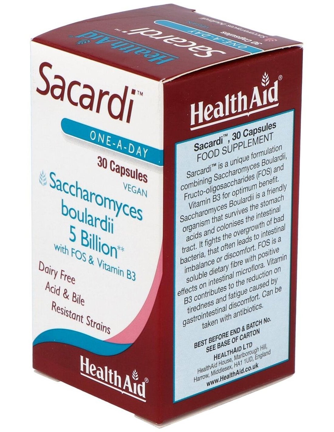 Sacardi (Saccharomyces Boulardii) 30Vcaps. de Health Aid es un suplemento probiótico para personas que buscan apoyar la salud digestiva, formulado con Saccharomyces Boulardii para contribuir al equilibrio intestinal.