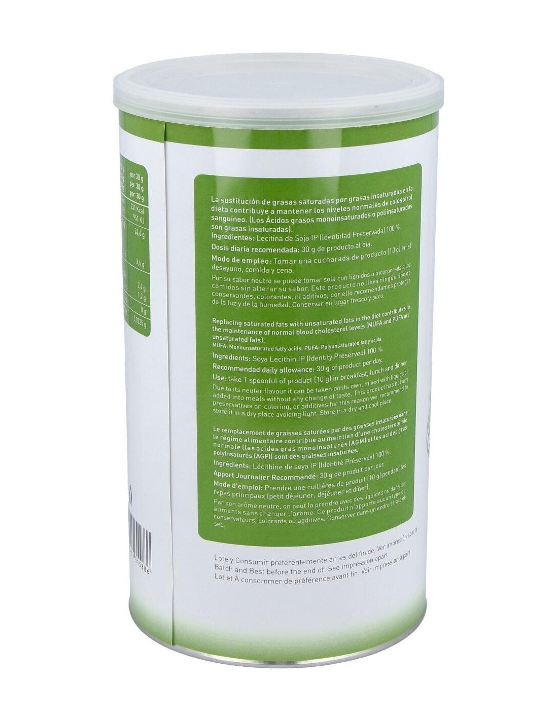 - Contiene lecitina de soja en presentación de 400 gramos, facilitando su dosificación y almacenamiento.
