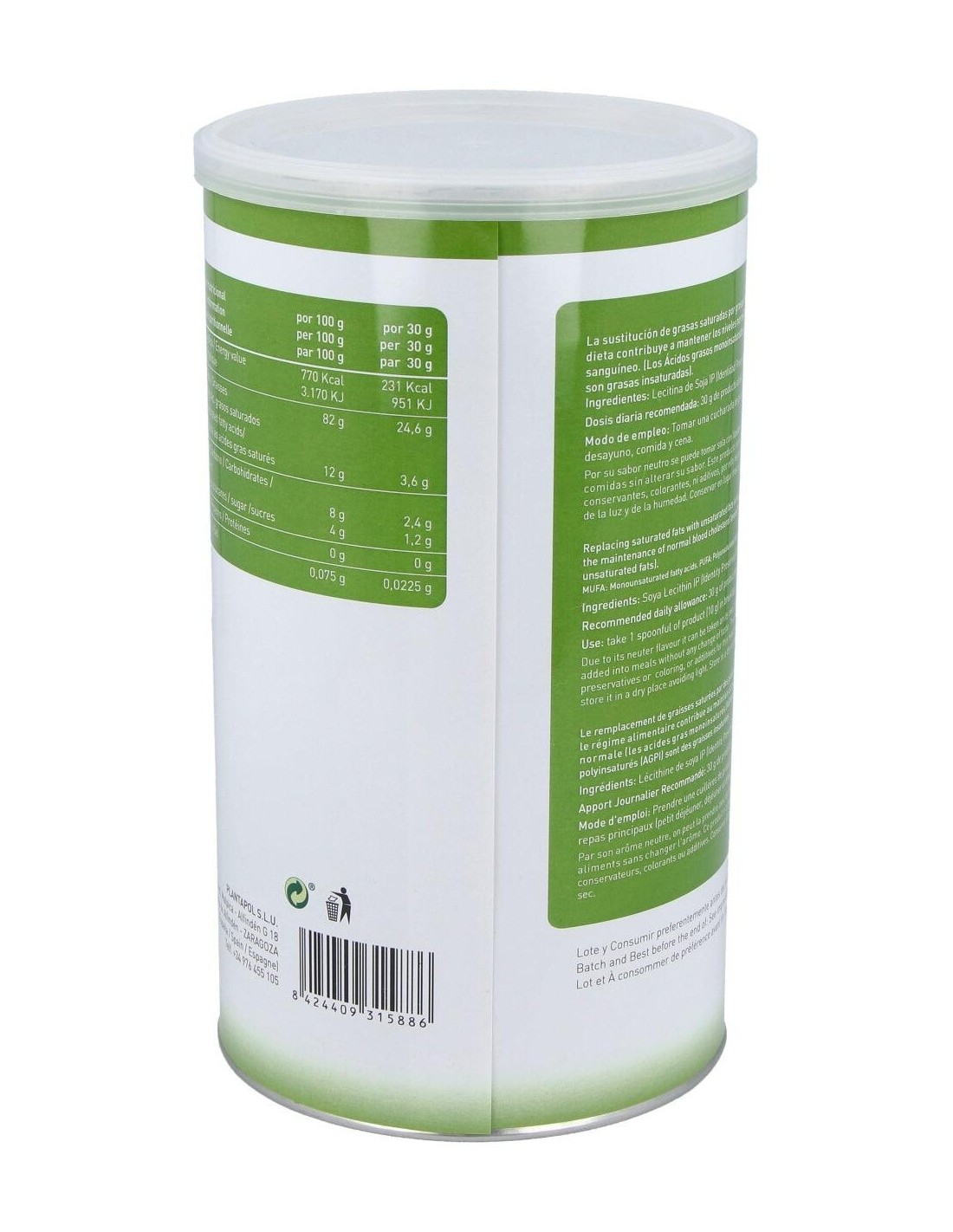 Lecitina De Soja Bote 400Gr Ip de Plantapol es un suplemento alimenticio pensado para quienes buscan incorporar un ingrediente natural que favorece la nutrición diaria. Este producto es adecuado para personas interesadas en mantener un estilo de vida equilibrado mediante el consumo de componentes derivados de la soja.