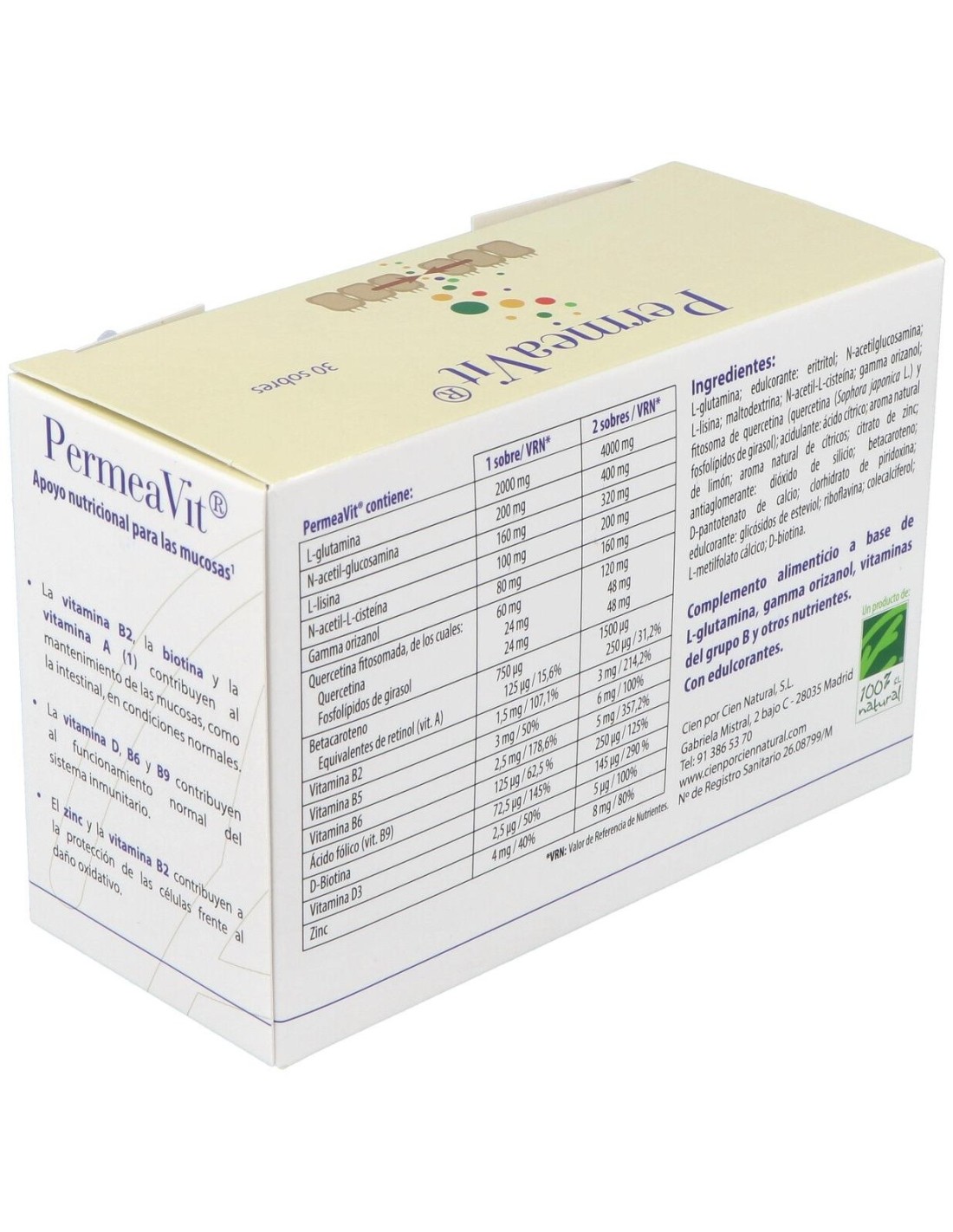 Permeavit 30Sbrs. de Cien Por Cien Natural es un suplemento diseñado para personas que buscan apoyar su bienestar de manera natural. Su formulación está orientada a quienes prefieren opciones con ingredientes de origen natural para complementar su rutina diaria.