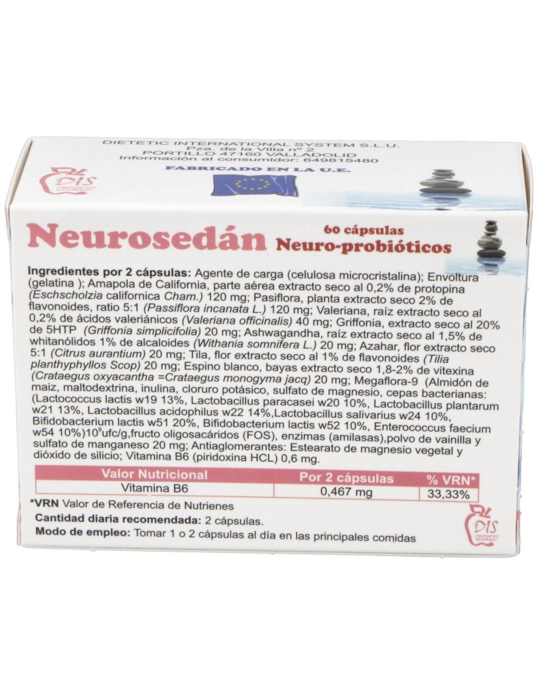Neurosedan Neuro-Probiotic 60Cap. de Dis es un suplemento diseñado para personas interesadas en apoyar su bienestar neurobiológico a través de una fórmula que combina probióticos específicos. Está dirigido a quienes buscan complementar su rutina diaria con ingredientes que contribuyen al equilibrio intestinal y al funcionamiento general del sistema nervioso.