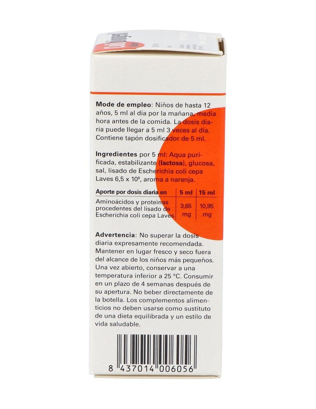 Lisado de Escherichia coli ( cepa Laves1931) 6,5 x 108 Lactosa (procedente de la leche) 0,74g, glucosa 0,04g, sal 0,02g, agua purificada. Aroma natural de naranja.