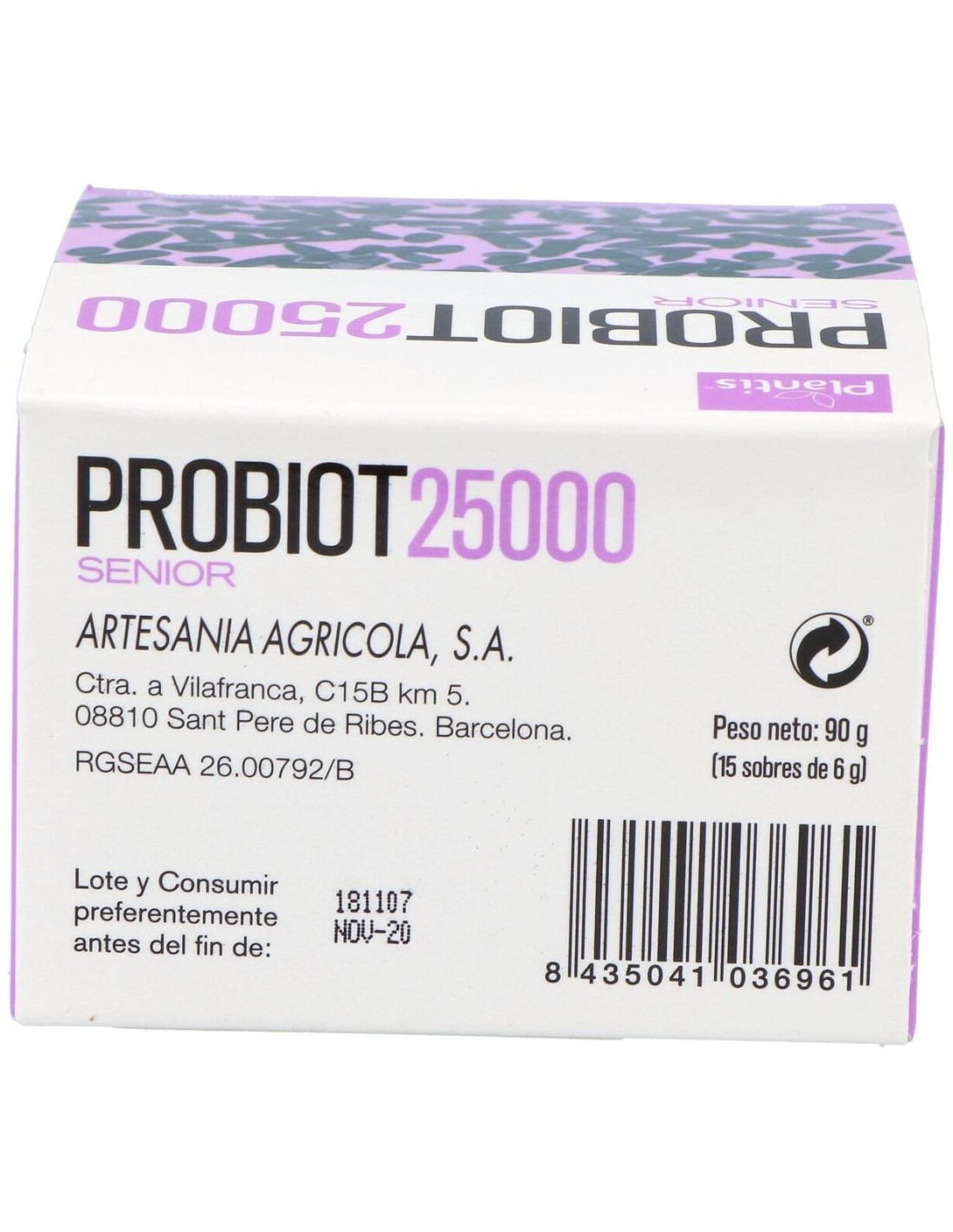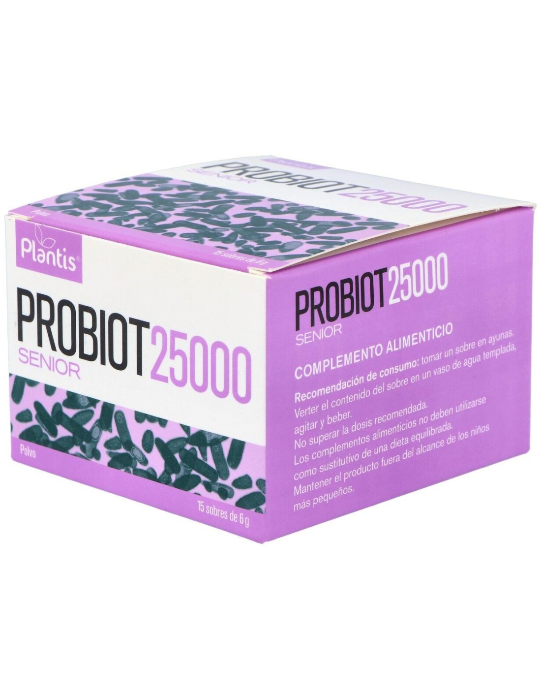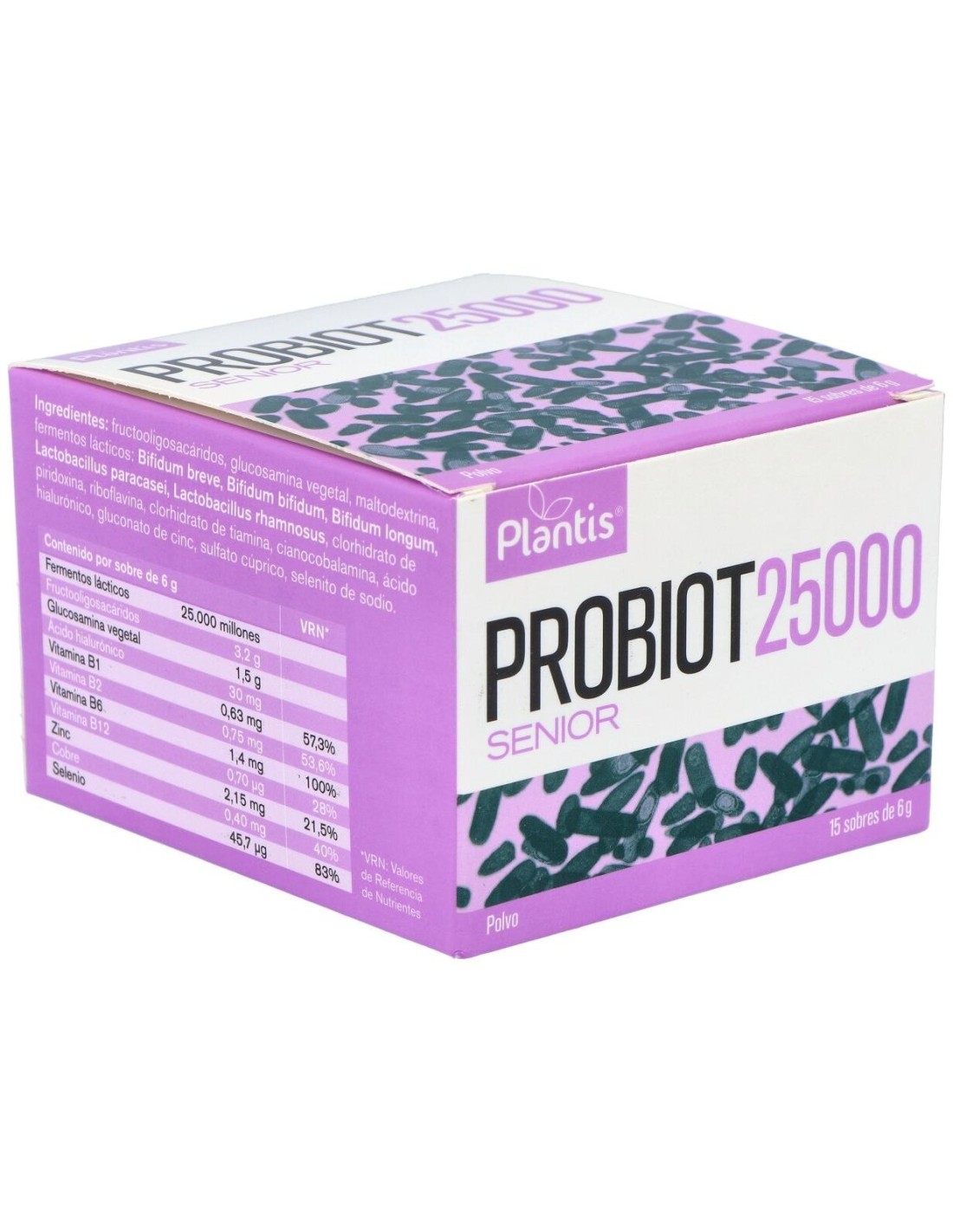 Probiot 25000 es preparado a base de fructooligosacáridos (prebiótico), probióticos y activos funcionales pensado para personas con dificultades gastrointestinales a los cuales se suman problemas articulares y que en general manifiestan un deterioro de la salud ligado a la edad.Con fructooligosacáridos, glúcidos de origen natural (clasificados dentro de los oligosacáridos) que se encuentran en frutas, cereales y verdura, y que gracias a su estructura química, no pueden ser digeridos por el tracto digestivo humano, por tanto pueden ser considerados como parte de la fibra dietética (prebiótico), favorecimiento el desarrollo de la flora intestinal.Con probióticos, organismos microscópicos vivos que ayudan a equilibrar la microbiota gastrointestinal. Los probióticos son el suplemento necesario para asegurar la victoria de las bacterias buenas sobre las bacterias malas, consiguiendo aislarnos de las toxinas, reforzar nuestro sistema inmunológico e incluso tener una piel fresca, hermosa y radiante.Con vitaminas del grupo B: esenciales para mantener un metabolismo activo y obtener energía de manera rápida y eficaz. Ayudan al organismo a utilizar grasas y proteínas de manera eficiente para ayudar en la digestión, mantener el corazón, la piel, las articulaciones y el sistema nervioso sanos y completamente operativos.Con glucosamina vegatal y ácido hialurónico: colaboran en la disminución de dolor articular y actúan lubrificando las articulaciones de los cartílagos y ligamentos; el ácido hialurónico también actúa como protector frente a las fuerzas mecánicas.Con zinc, cobre y selenio: importantes antioxidantes y reguladores del sistema inmunitario, es importante incorporar-los a la dieta ya que no pueden ser sintetizados por nuestro organismo. Su déficit provoca una reducción del número de células inmunitarias, y por tanto una disminución de su actividad defensora.Composición activa por sobre: