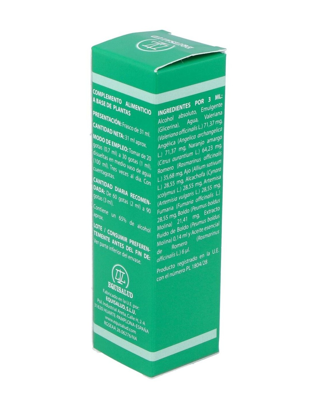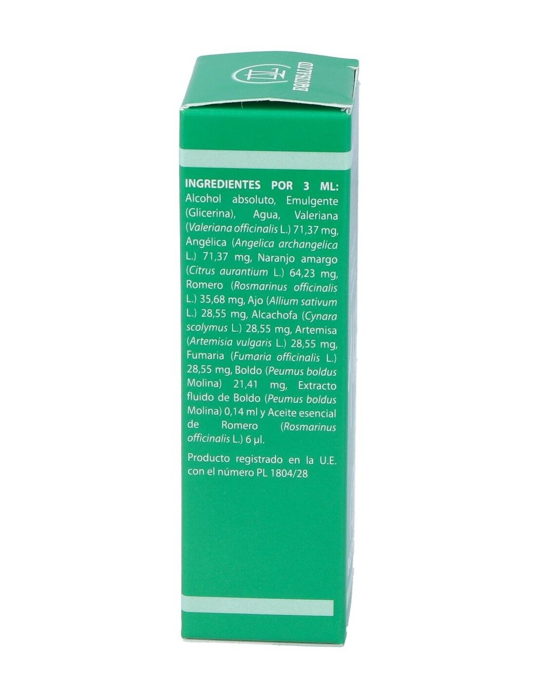 En la patología occidental este síndrome se identifica con ciertas neurosis, cistitis crónica, dismenorrea y alteraciones menstruales, ciertas faringitis, dispepsias biliares, otros trastornos digestivos, ansiedad y algunas depresiones. Causas psicoafectivas generalmente. Manifestaciones asociadas a este síndrome: Depresión e irritabilidad, suspiros, ansiedad, sueño inquieto, opresión torácica, dolor e hinchazón del pecho en seno y en bajo vientre, dismenorrea (dolor por estancamiento), menstruación irregular; pulso tenso, sensación de cuerpo extraño en garganta, sensación de plenitud o dolor epigástrico, regurgitaciones ácidas, gases, eructos. Masas fijas o móviles en vientre, dolor en los flancos. Se da en personas contrariadas. Composición:Angélica (Angelica archangelica), Boldo (Peumus boldus), Alcachofa (Cynara scolymus), Fumaria (Fumaria officinalis), Romero (Rosmarinus officinalis), Ajo (Allium sativum), Artemisa (Artemisia vulgaris), Azahar (Citrus aurantium), Naranja amarga (Citrus aurantium var amarus), Valeriana (Valeriana officinalis). Modo de empleo:Tomar de 20 a 30 gotas disueltas en medio vaso de agua, 3 veces al día. Presentación:Frasco de 31 ml.