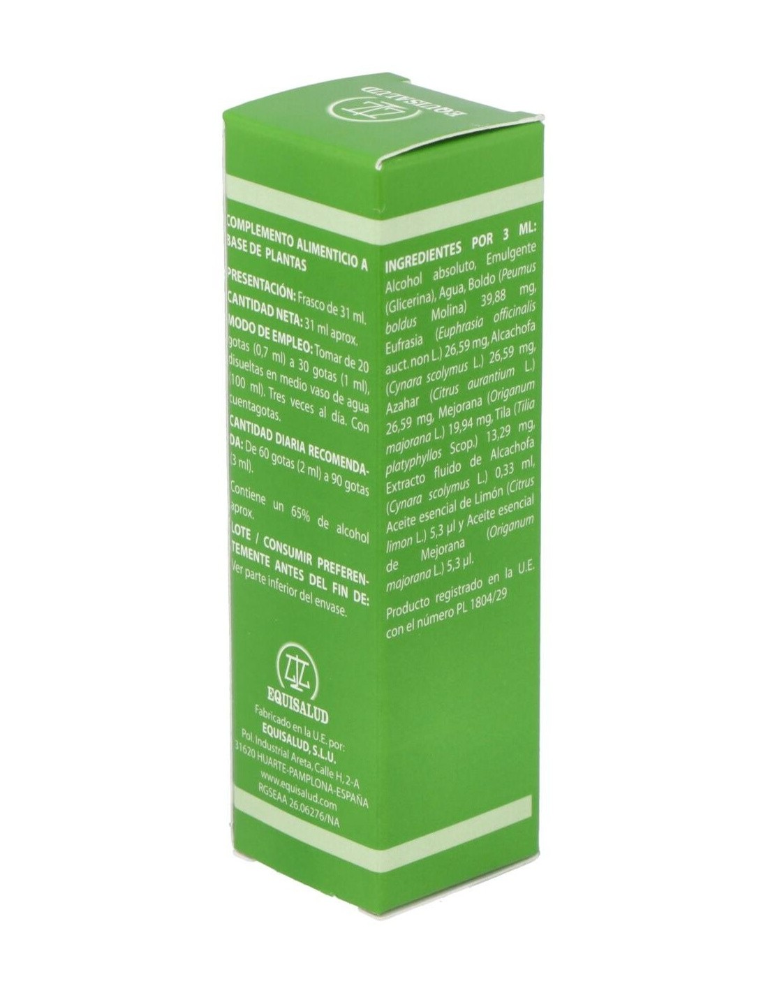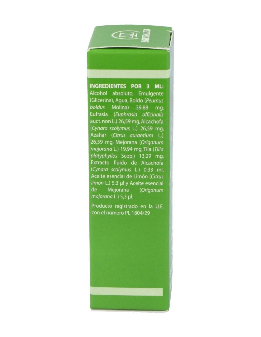 Se trata de un exceso de actividad hepática y/o biliar que trasciende el ámbito puramente hepático y produce un exceso calor-plenitud de otros terrenos esencialmente hacia la parte alta del organismo. Manifestaciones asociadas a este síndrome: El fuego del hígado quema, sube y afecta a los ojos y la cabeza. La cara está roja y los ojos son rojos y dolorosos. Cefaleas que se acompañan con los signos anteriores. Vertigos y acufenos. A veces hasta sordera y sensación de hinchazón e incluso pus en oído. Si la energía de vesícula biliar acompaña el fuego del hígado hay boca amarga y sequedad de garganta. Si continúa escapándose hay nerviosismo, agitación, cólera fácil. Intranquilidad, insomnio, pesadillas. Cuando el fuego hiere los líquidos orgánicos hay estreñimiento y orinas fuertes. Lengua roja (bordes y punta), con capa amarilla y espesa. Pulso tenso, rápido y lleno. Composición:Boldo (Peumus boldus), Alcachofa (Cynara scolymus), Limón (Citrus limon), Mejorana (Origanum majorana), Azahar (Citrus aurantium), Eufrasia (Euphrasia officinalis), Tila (Tilia platyphyllos). Modo de empleo:Tomar de 20 a 30 gotas disueltas en medio vaso de agua, 3 veces al día. Presentación:Frasco de 31 ml.Precauciones:No utilizar en caso de tratamiento antihipertensivo.